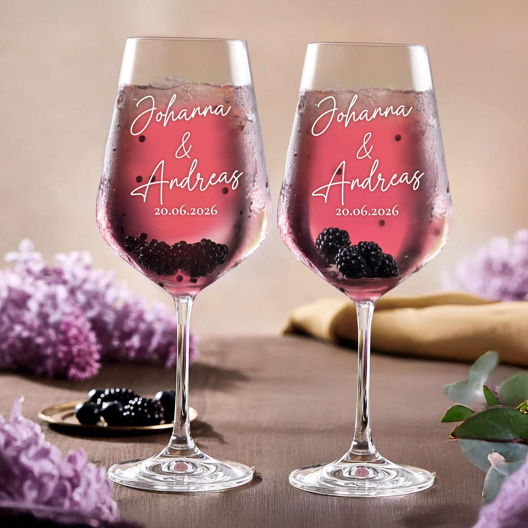 Dieses stilvolle 2er-Set personalisierter Weingläser ist die ideale Geschenkidee für besondere Anlässe wie Hochzeiten, Verlobungen, Jubiläen oder einfach als Ausdruck liebevoller Zweisamkeit. Die Gläser werden mit zwei Namen und einem Wunschdatum in eleganter Script-Schrift graviert – ein bleibendes Erinnerungsstück für Weinliebhaber und Paare, die gemeinsam genießen möchten. Ob romantischer Abend, festliche Tafel oder Weinverkostung – mit diesen gravierten Gläsern wird jeder Moment besonders.