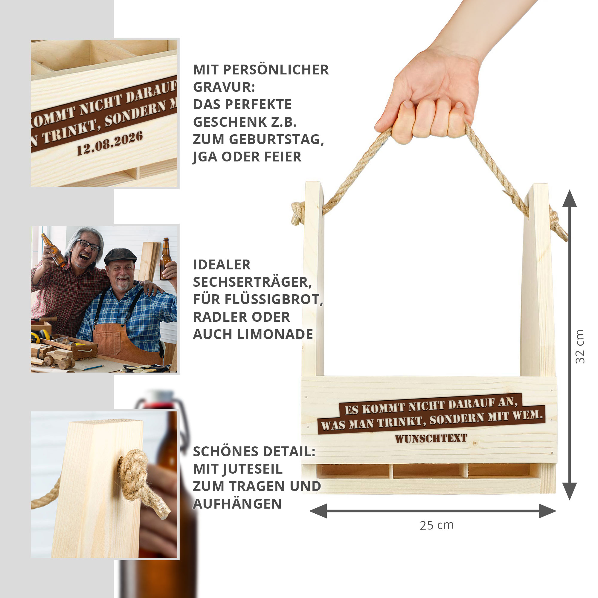 Der stabile Bierträger eignet sich ideal für gemeinsame Momente – sei es als Geschenk für Paare, für Freunde und Kollegen, für den Sportverein oder für den Junggesellenabschied. Auch kreative Gravuren wie für das beste Team der Welt oder ein individueller Anlass machen diesen Bierkasten zu einem echten Unikat. Dank des robusten Tragegriffs und der hochwertigen Verarbeitung ist die Bierkiste der perfekte Begleiter für Ausflüge, Feiern und gesellige Abende.
