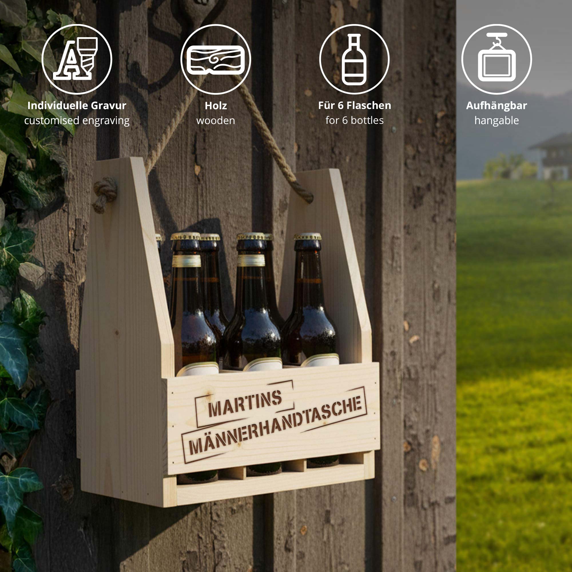 6er Holz Flaschenträger mit Gravur - Männerhandtasche