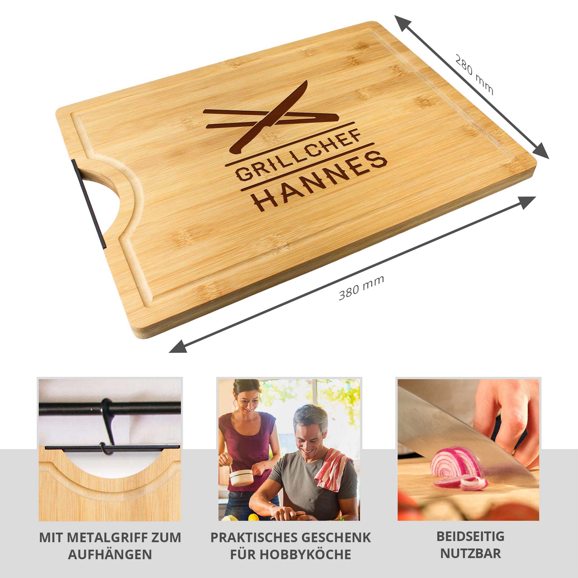 Unser graviertes Schneidebrett mit Griff bietet nicht nur eine großzügige Arbeitsfläche für die Zubereitung köstlicher Grillgerichte, sondern auch eine praktische Abflussrille, die überschüssigen Saft und Flüssigkeiten effizient abführt. Hergestellt aus hochwertigem Bambusholz, vereint dieses Schneidebrett Funktionalität mit ästhetischem Design und ist ein Blickfang in jeder Küche. Bringe Deine Grillkünste auf ein neues Level!