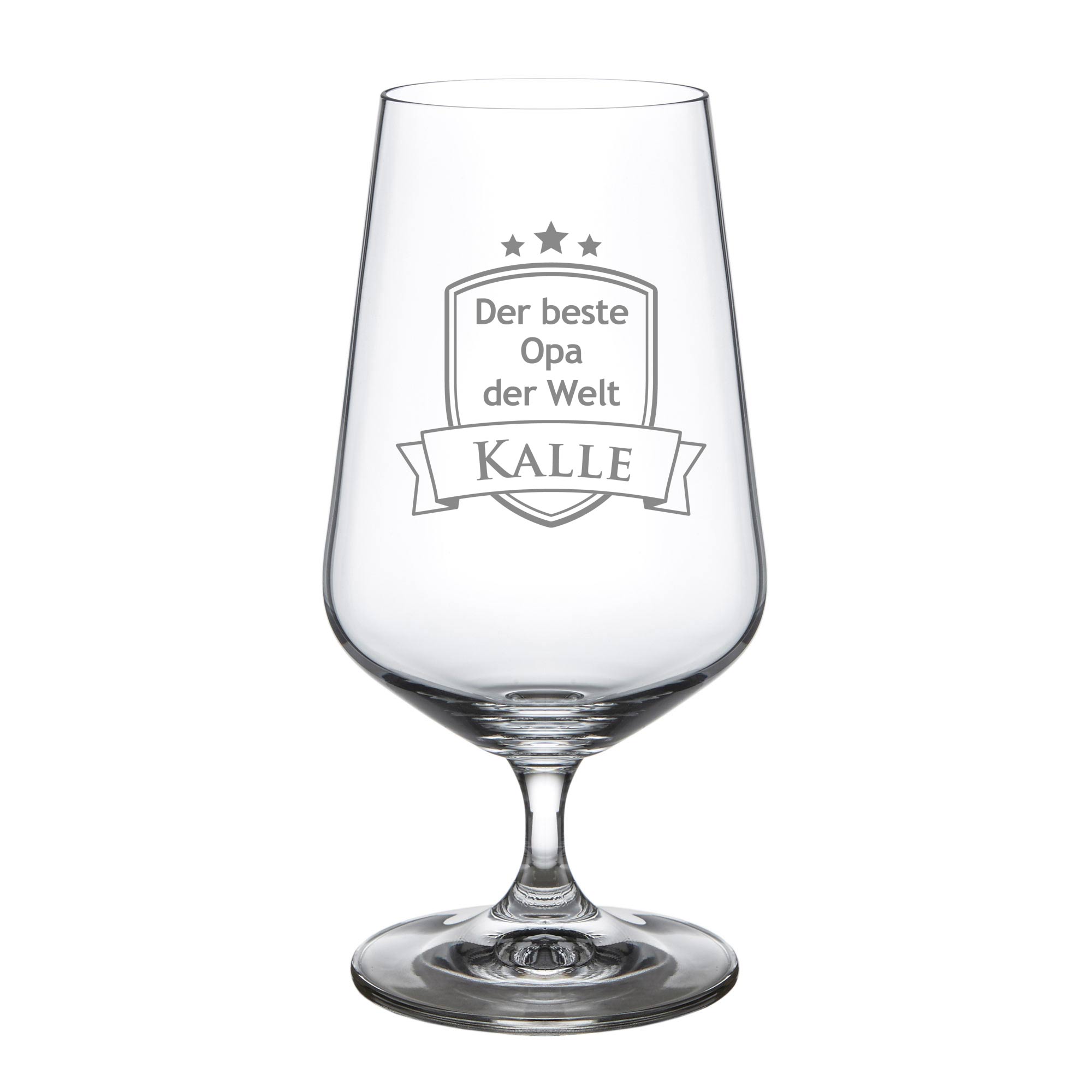 Wenn der Großvater mal ein Bier trinkt, dann sollte es auch aus einem entsprechend besonderen Glas sein. Unser Bierglas mit Gravur - Bester Opa - Motiv Wappen ist ideal dafür. Die schöne Gravur auf dem Glas auf dem Glas in der klassischen Form der Pilstulpe macht zu einer besonderen Geschenkidee für den Großvater - noch individueller wird es durch die persönliche Namensgravur auf dem Bierglas.