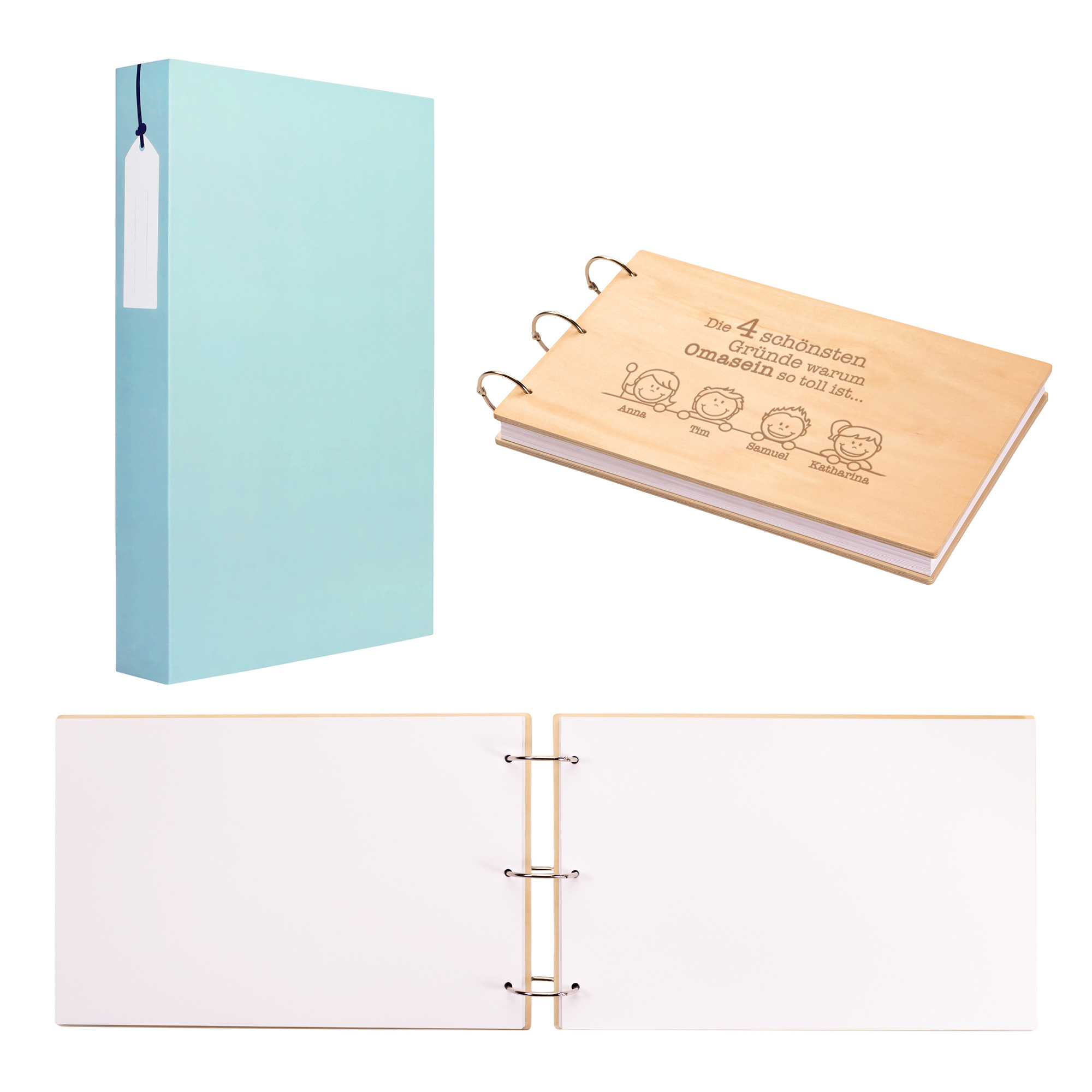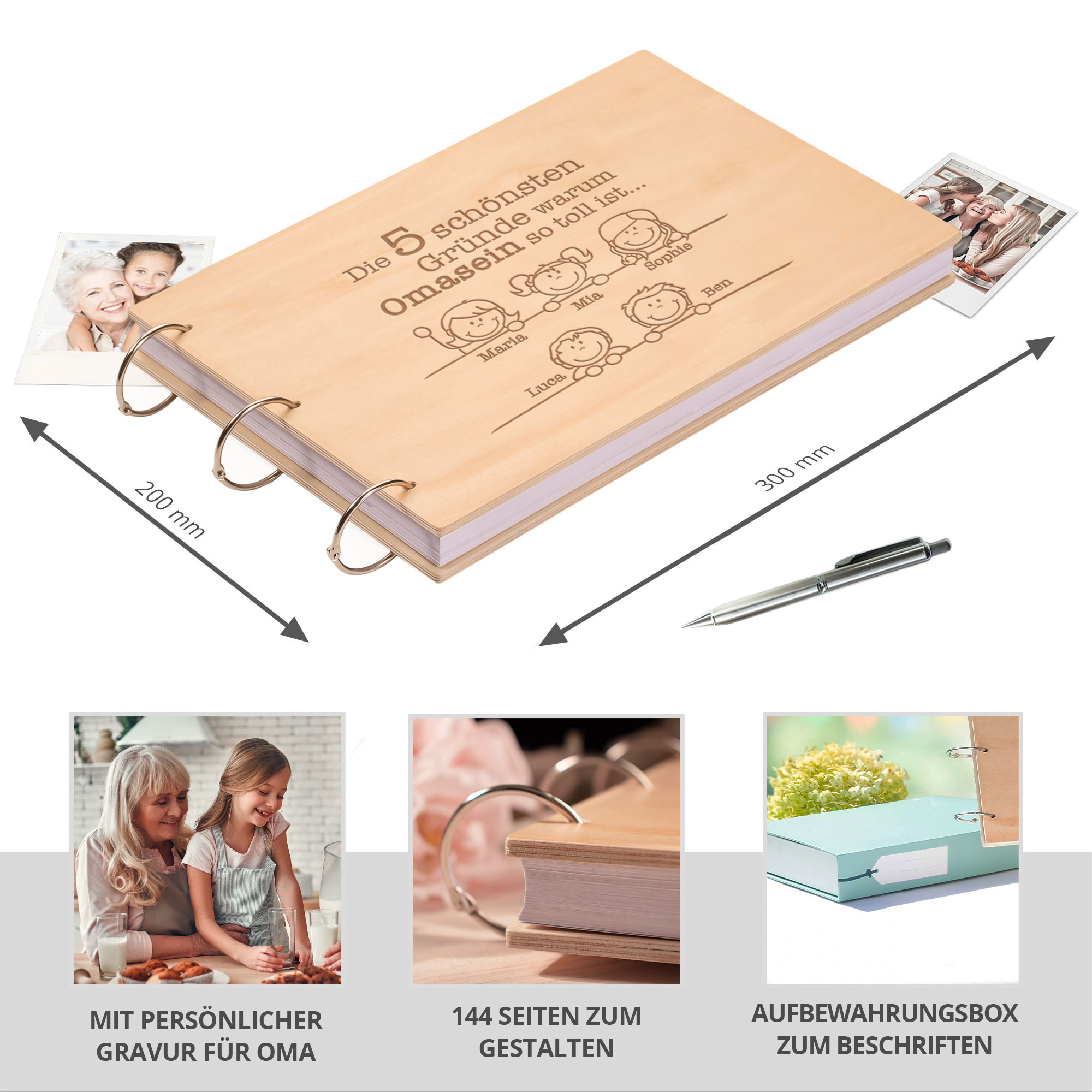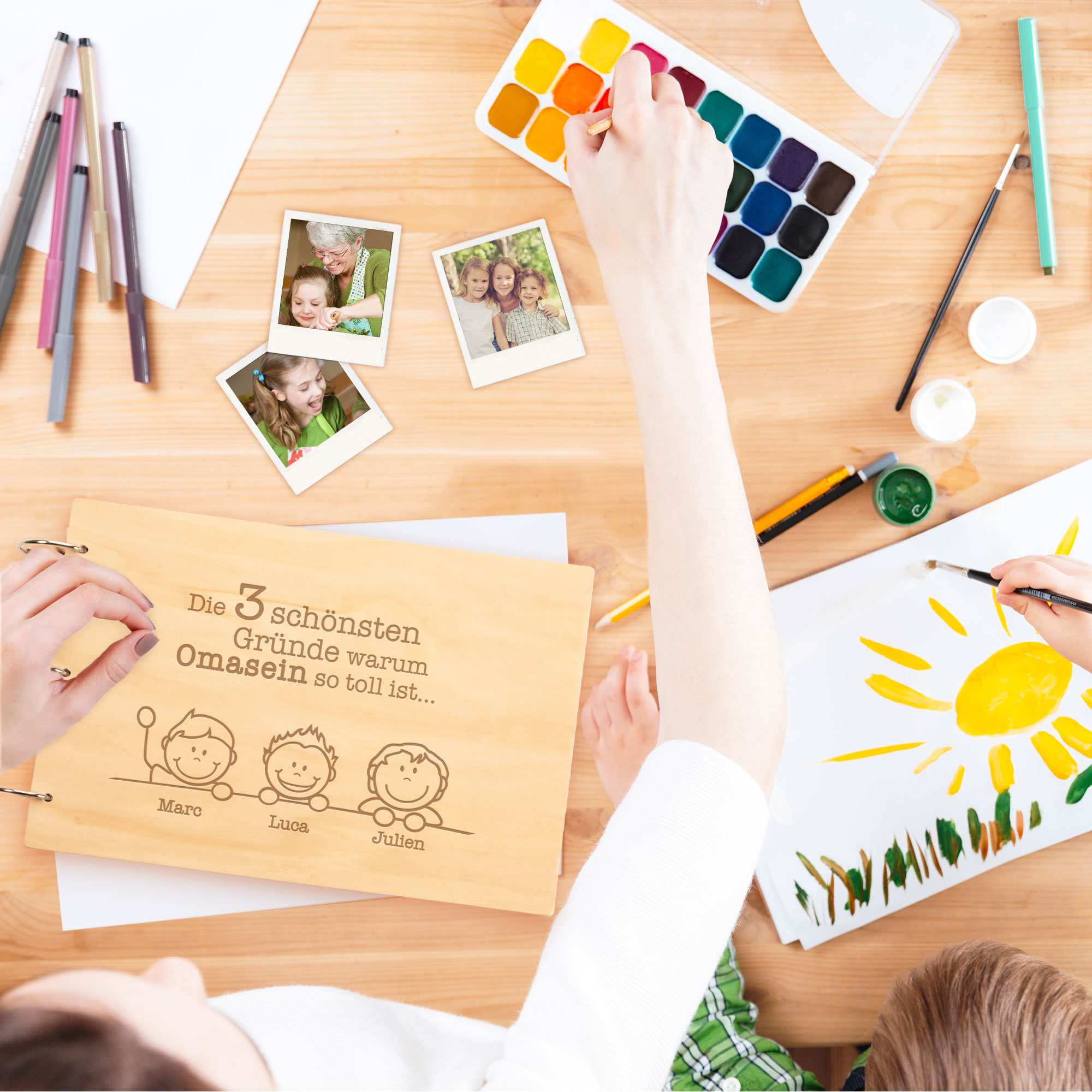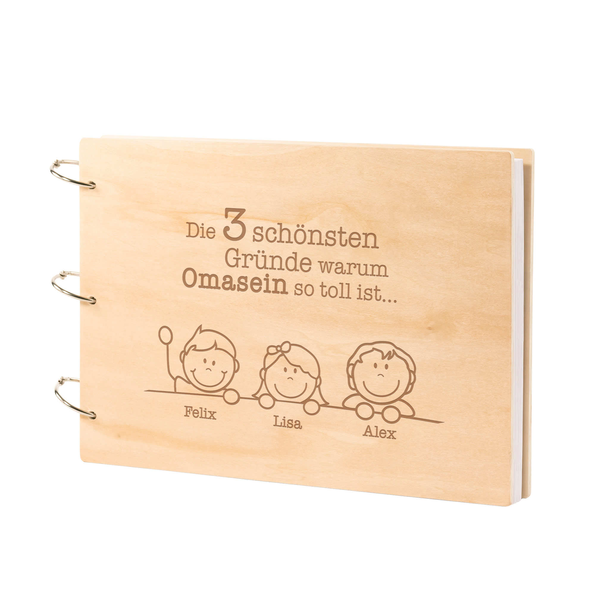 Das Fotobuch wird mit dem edlen Holzcover und der personalisierten Gravur auf der Vorderseite zum absoluten Blickfang bei der Geschenkübergabe. Unter dem Spruch "Die X schönsten Gründe warum Omasein so toll ist..." werden bis zu 5 Kindergesichter mit den Namen der Enkel eingraviert, damit direkt klar wird, wer für das wundervolle Erinnerungsbuch Meisterwerk verantwortlich ist.