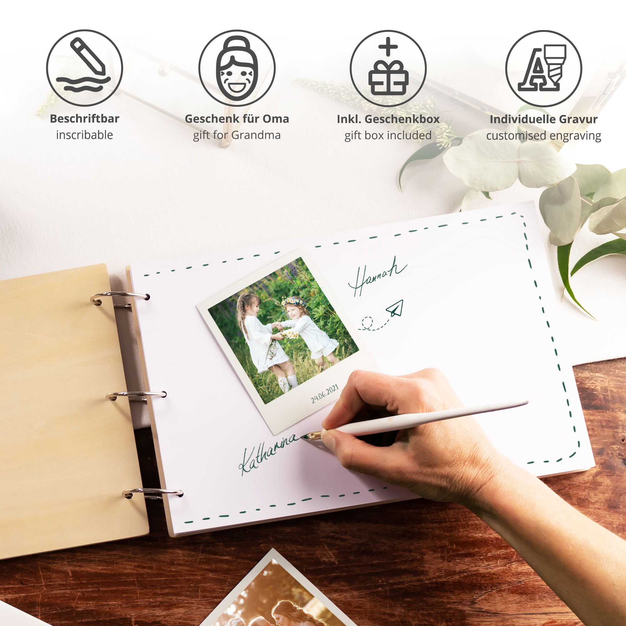 Großmütter lieben die Erinnerungen an die Erlebnisse mit ihren aufwachsenden Enkelkindern. Schnapp Dir Deine Geschwister und gestalte Deiner Oma ein emotionales Erinnerungsalbum eurer gemeinsamen Zeit. Sammelt Fotos, Kinderzeichnungen, Anekdoten oder andere Andenken und füllt die 144 weißen Seiten des Fotoalbums zum Selbstgestalten nach euren Vorstellungen. Ein persönliches Geschenk für die Großmutter zum Geburtstag oder zu anderen Anlässen wie Weihnachten oder Ostern!