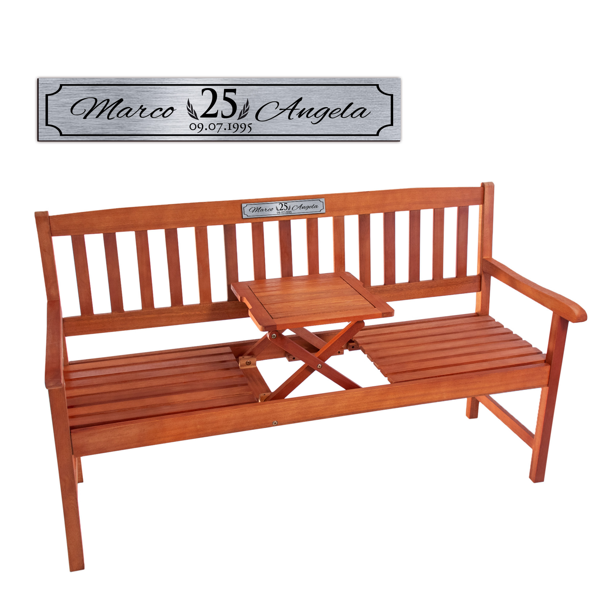 Gartenbank zur Silberhochzeit aus Holz mit personalisierter Plakette