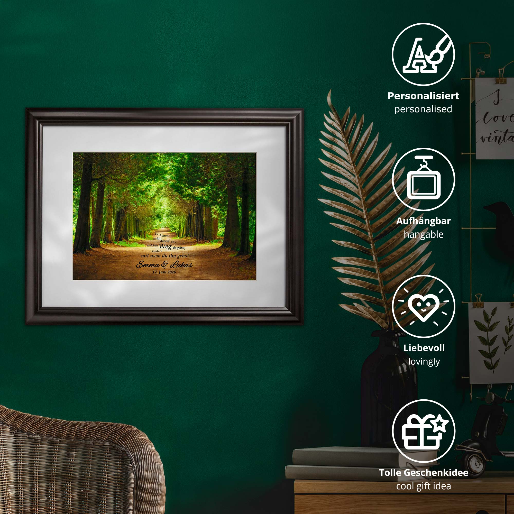 Der Weg ist zu schön, um ihn alleine zu gehen - vor allem, wenn die Natur um einen herum erblüht. Das ist es, was unser Gemeinsamer Weg - Herbstbild - Ihre Namen im Bild zeigen soll. Es zeigt nicht nur einen schönen Frühlingsweg mit einem romantischen Spruch, sondern ist auch nocht mit Ihren Wunschnamen und Ihrem Wunschdatum personalisiert - als romantisches Geschenk verfehlt es seine Wirkung garantiert nicht. Das Bild wird als brillanter Farbdruck gefertigt undin einem hochwertigen Echtholzrahmen geliefert. Stilvoll und romantisch, persönlich und individuell. Denn was wäre der Frühling, wernn man ihn nicht zu zweit verbächte?