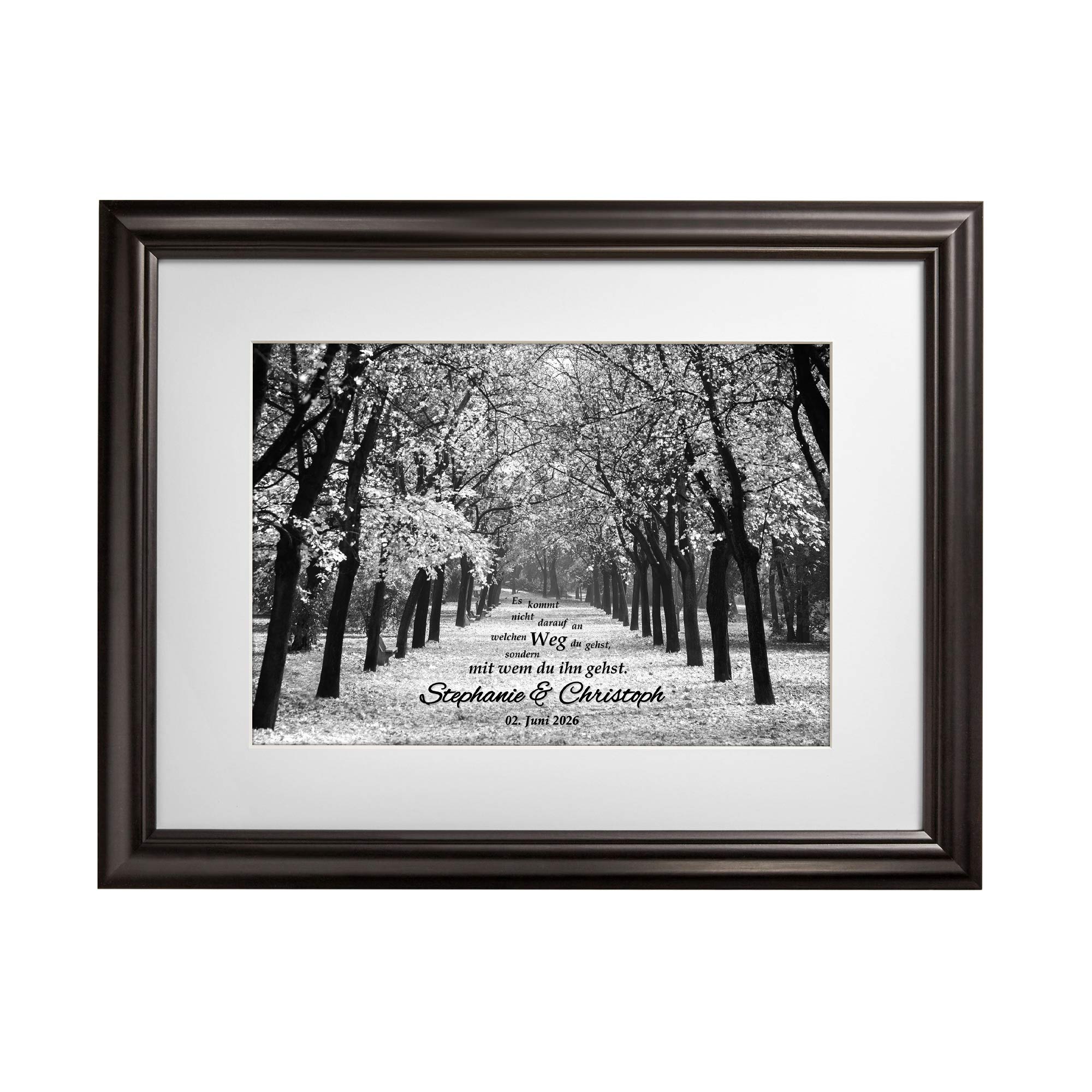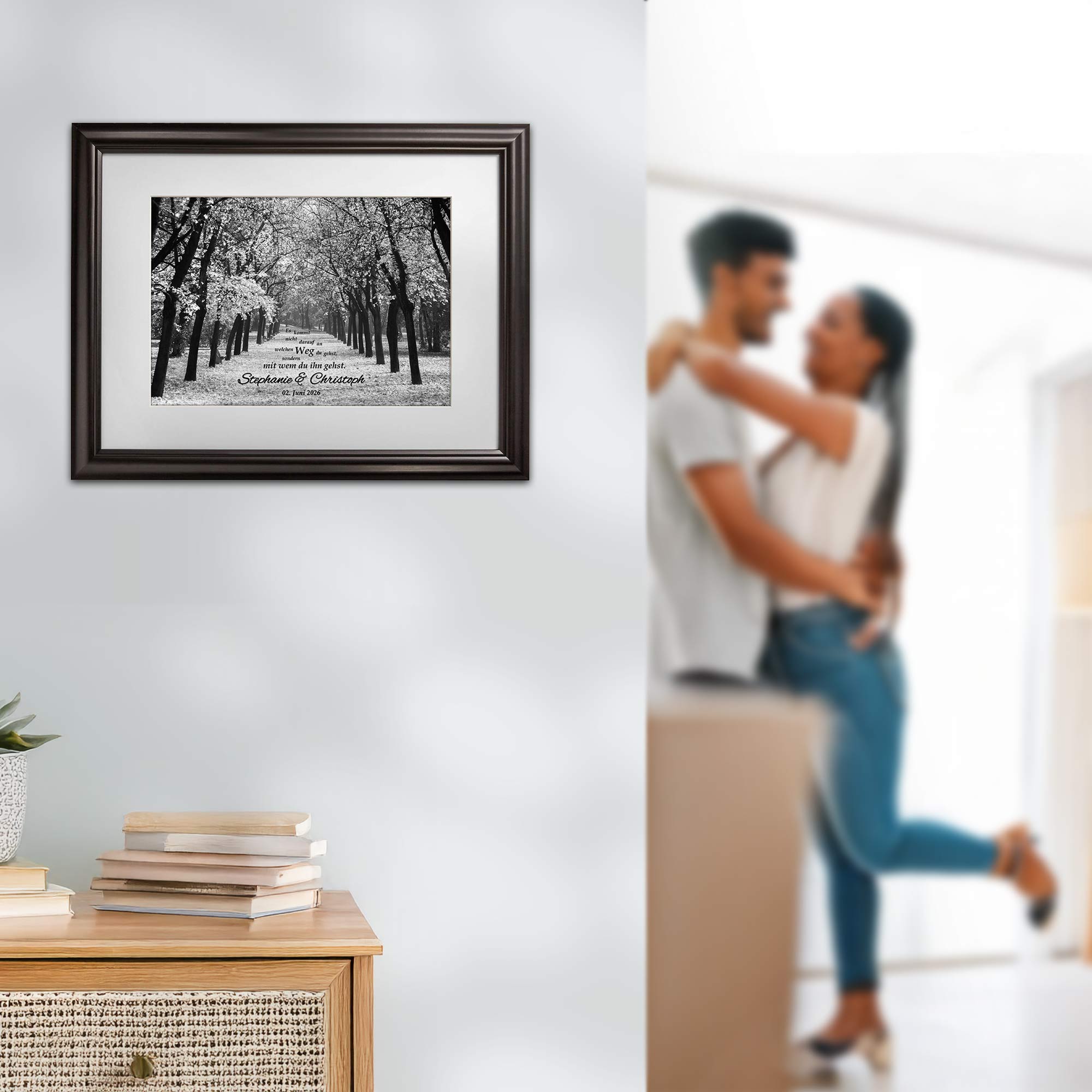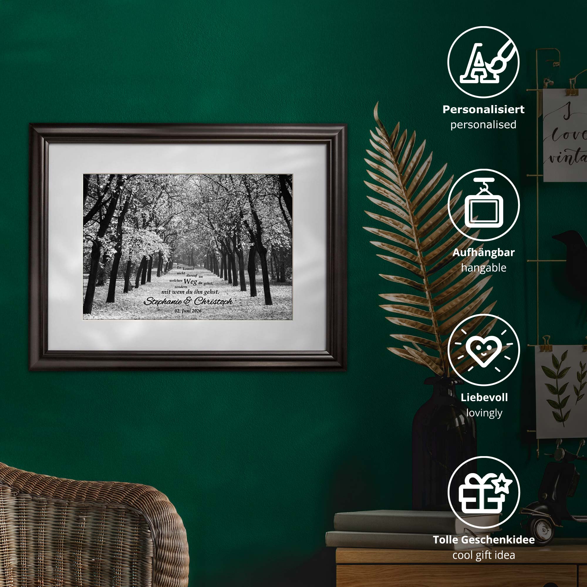 Jeder noch so lange und verschlungene Weg wird schöner, wenn man ihn gemeinsam mit einem geliebten Menschen geht. Mit unserem personalisierbarem Bild Gemeinsamer Weg Ihre Namen im Bild möchten wir das würdigen - als romantisches Geschenk zum Valentinstag, zur Goldenen Hochzeit oder zum 25jährigen Ehejubiläum verfehlt es seine Wirkung mit Sicherheit nicht. Der Spruch "Es kommt nicht darauf an, welchen Weg du gehst, sondern mit wem du gehst" mit den eigenen Namen und dem Wunschdatum darunter wird als brillanter Farbdruck gefertigt und in einem hochwertigen Echtholzrahmen geliefert. Stilvoll und romantisch, persönlich und individuell.