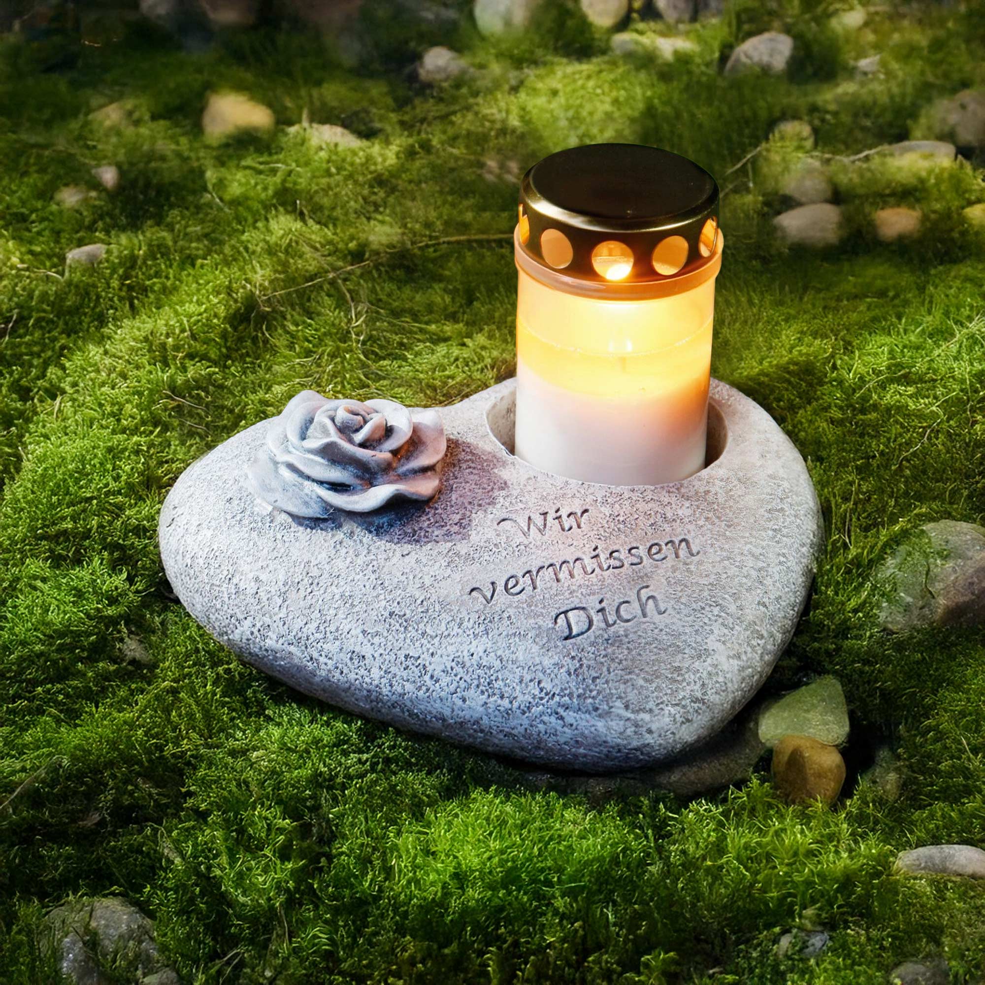 In der Mitte des Trauerherzens befindet sich eine integrierte Aussparung mit einem Durchmesser von ca. 7 cm – ideal für handelsübliche Grabkerzen oder Teelichter. Die Oberfläche ist wetterfest und pflegeleicht, sodass sich das Herz für den dauerhaften Einsatz im Außenbereich eignet. Ob auf dem Grab oder im persönlichen Gedenkbereich – dieses Grabherz ist ein wertvolles Andenken, das Licht und Erinnerung auf würdevolle Weise vereint.