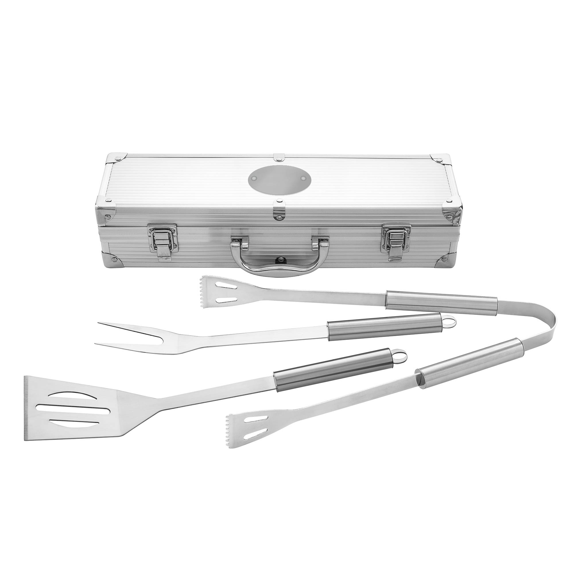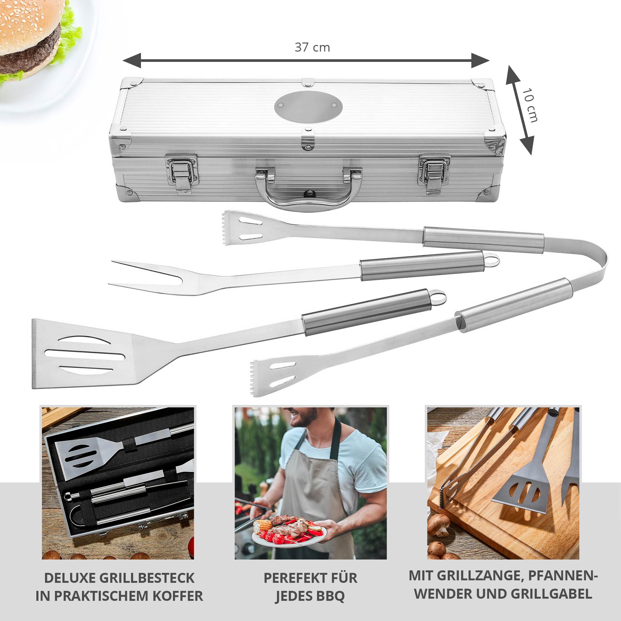 - Grillkoffer aus Edelstahl mit Zange, Spatel und Grillgabel, Brett aus Gummibaumholz