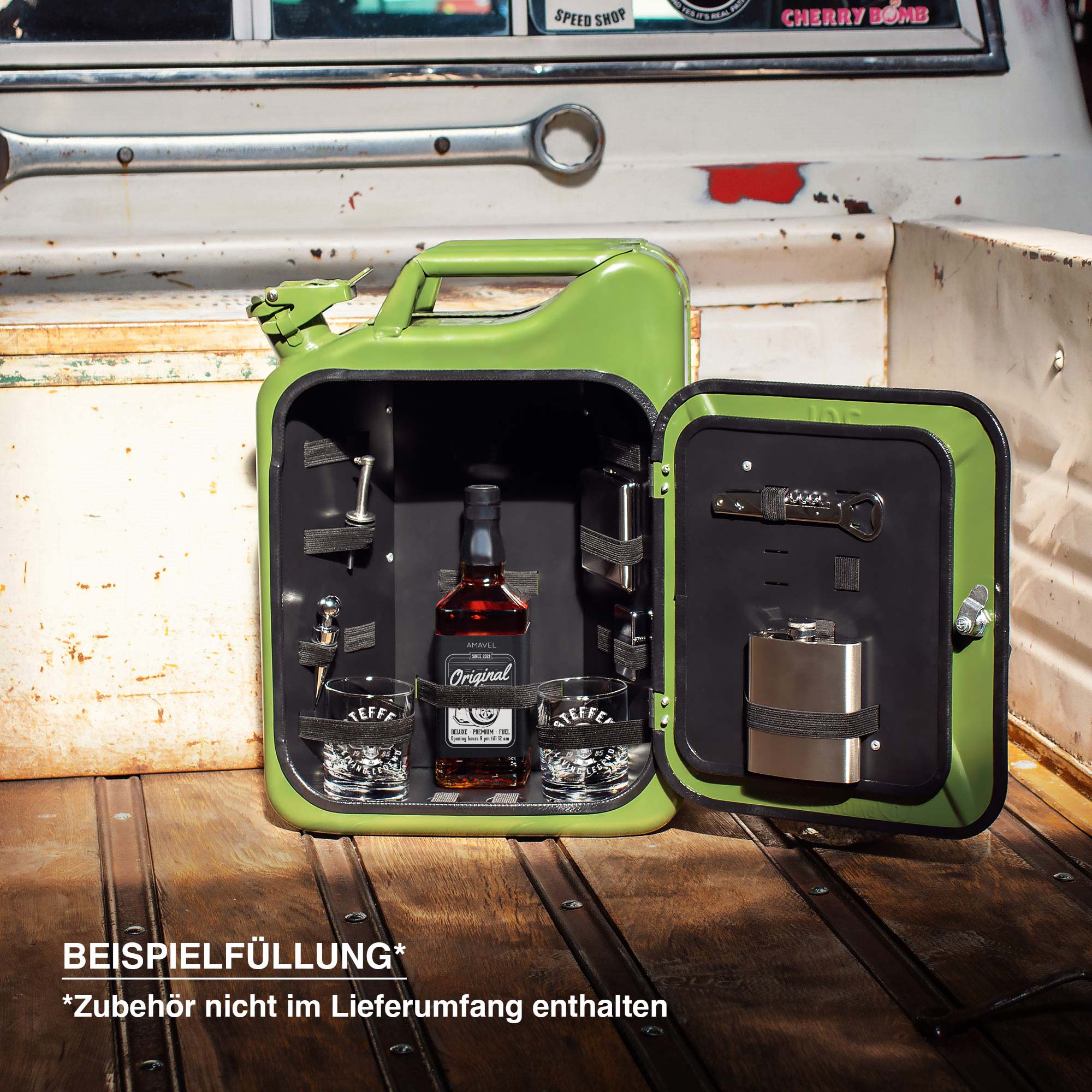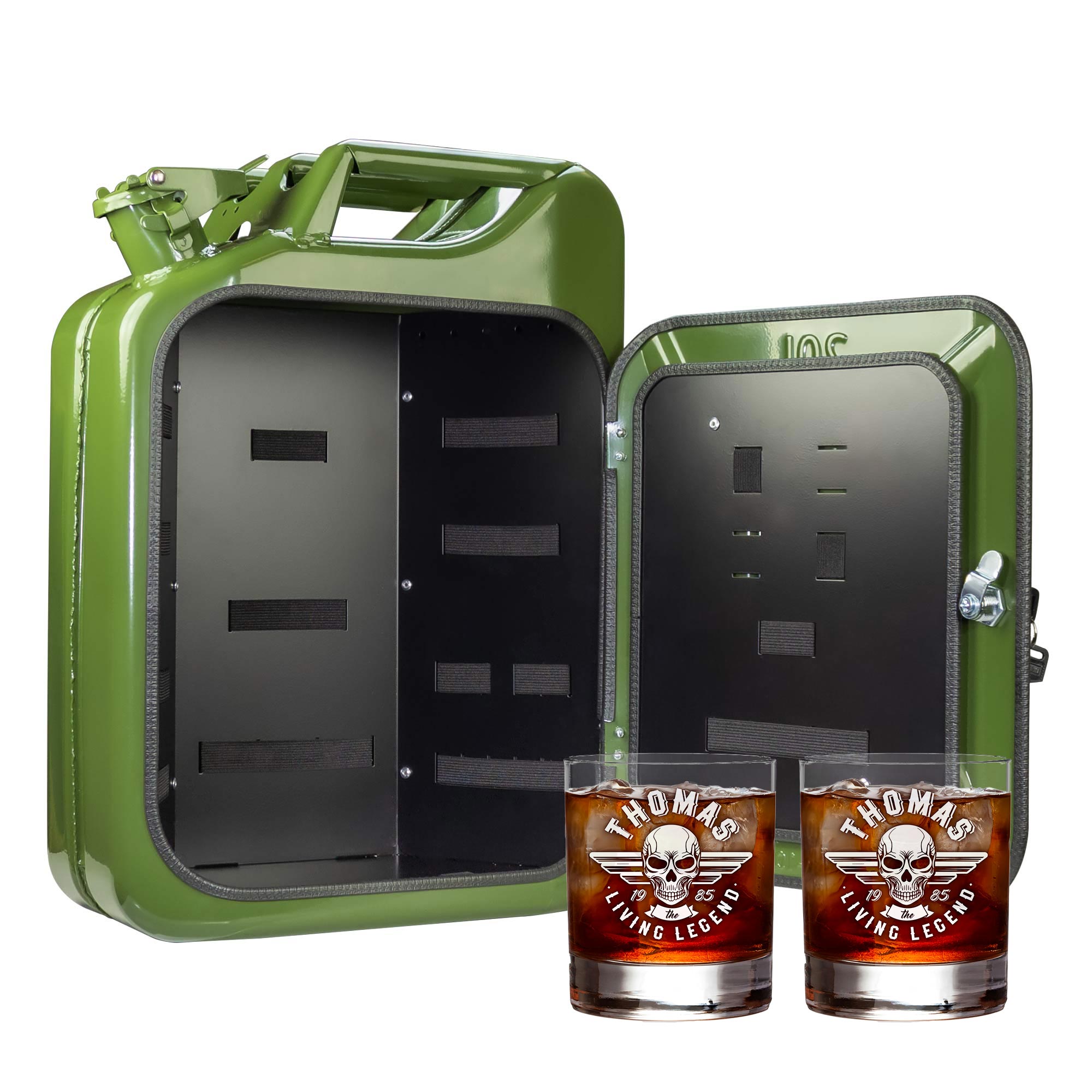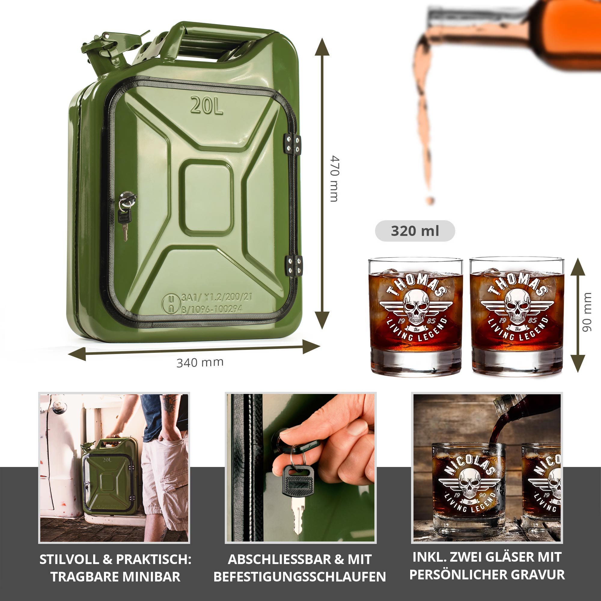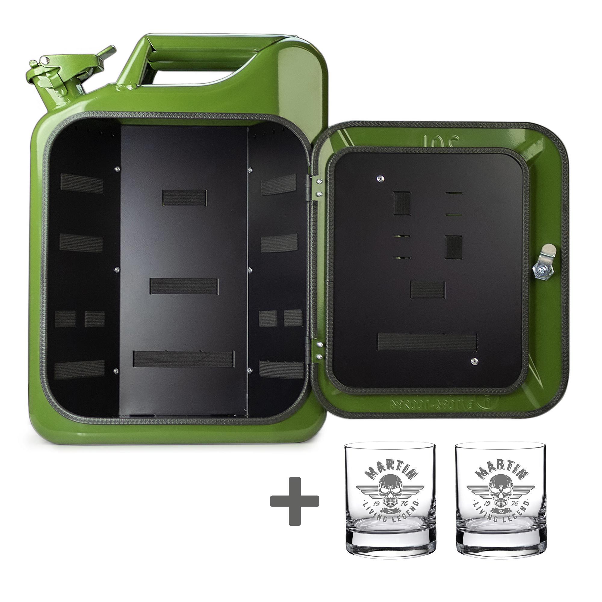 Grüne Minibar im Kanister mit 2 Whiskygläsern - Totenkopf Gravur