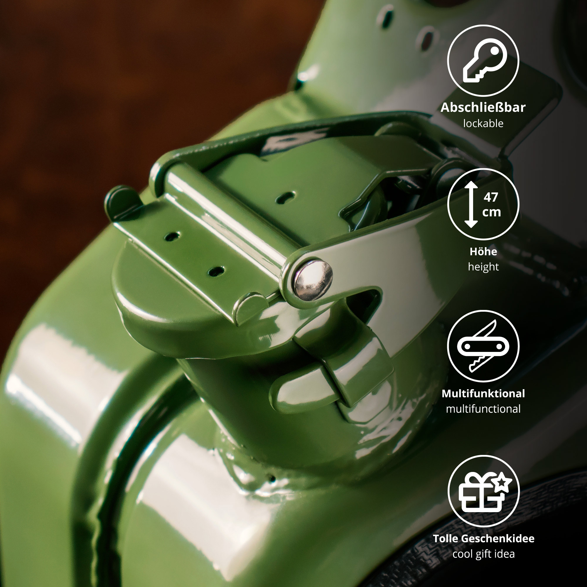 Die Kanisterbar in Grün mit zwei gravierten Whiskygläsern im Totenkopf-Design ist das ideale Geschenk für Männer mit Stil. Der 20-Liter-Kanister aus robustem, grün lackiertem Metall überzeugt durch seine hochwertige Verarbeitung und bietet im Inneren Platz für eine Whiskyflasche sowie weiteres Barzubehör (nicht enthalten). Das Highlight: Zwei formschöne Whiskygläser, veredelt mit dem markanten Living Legend-Totenkopf-Motiv und personalisiert mit Wunschname und Jahreszahl. Ein cooles Designstück für Zuhause, das auch unterwegs Eindruck macht – dank praktischem Tragegriff.