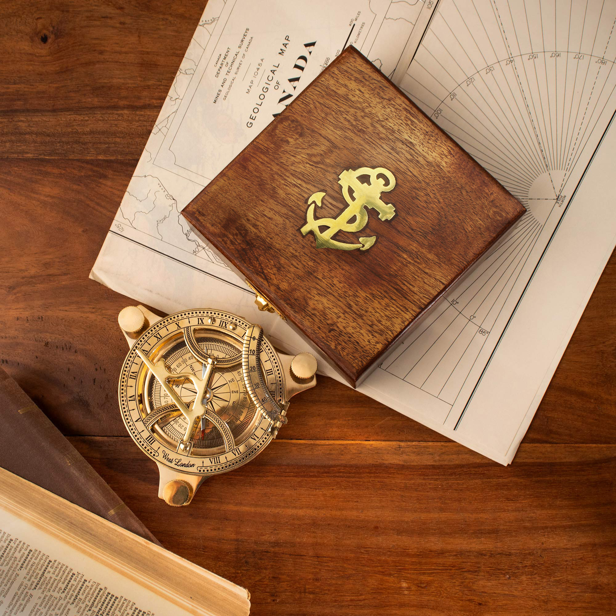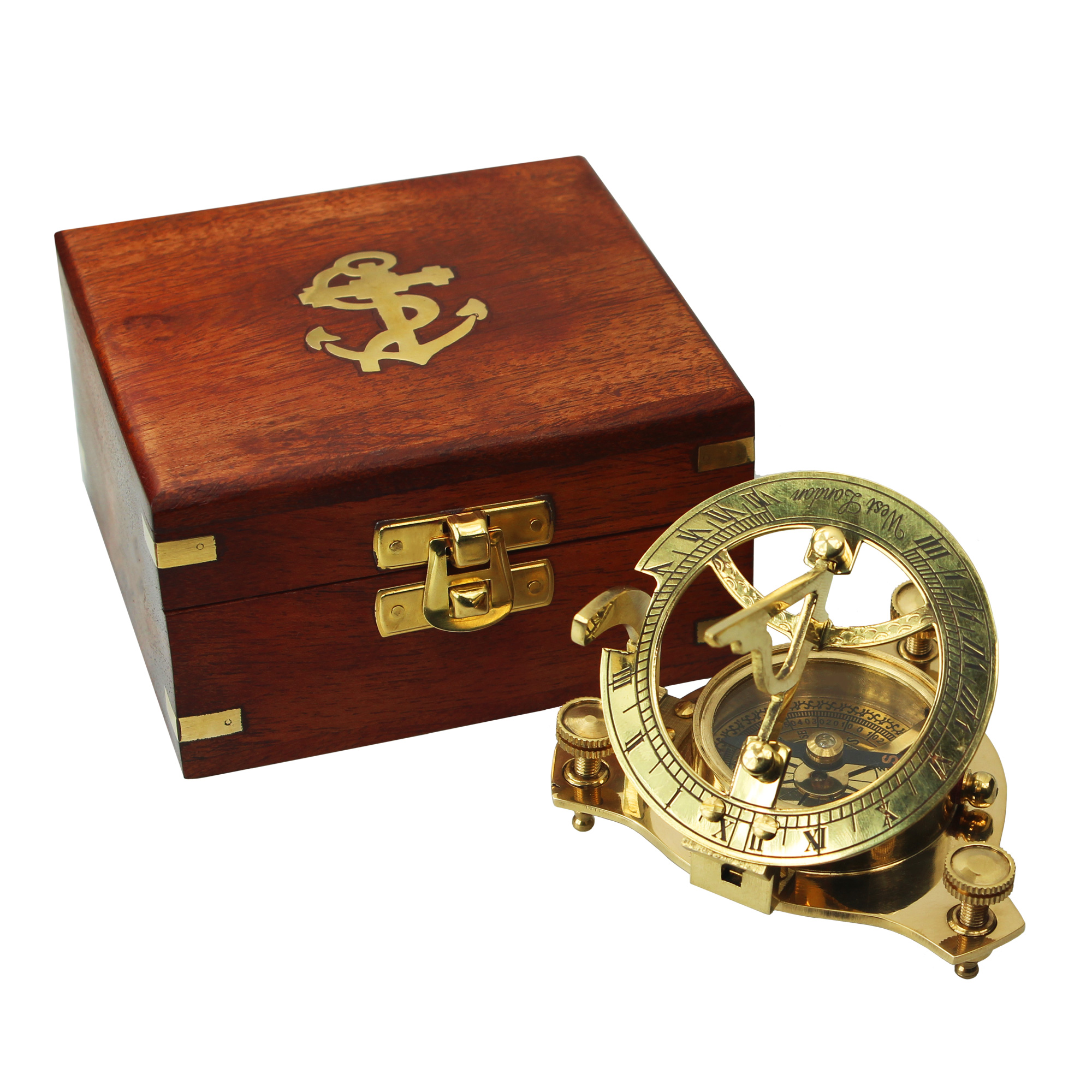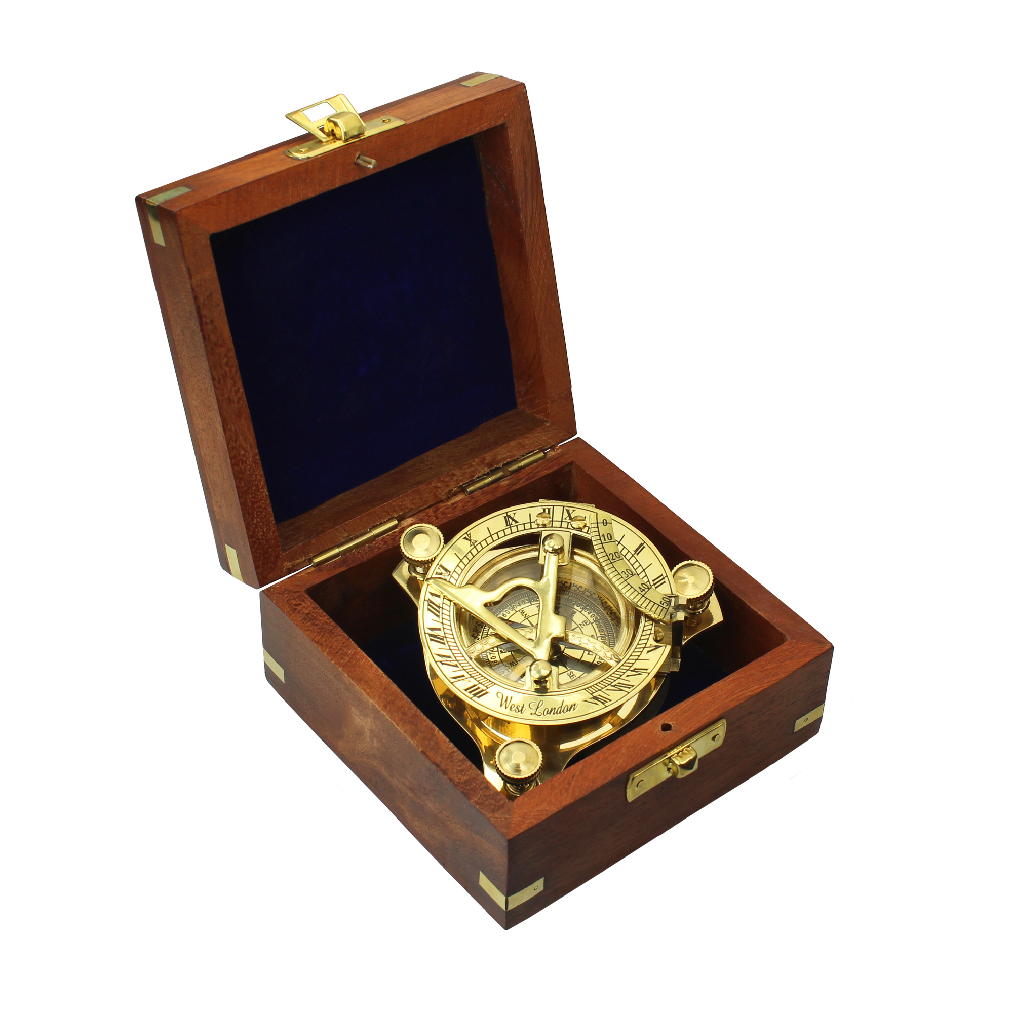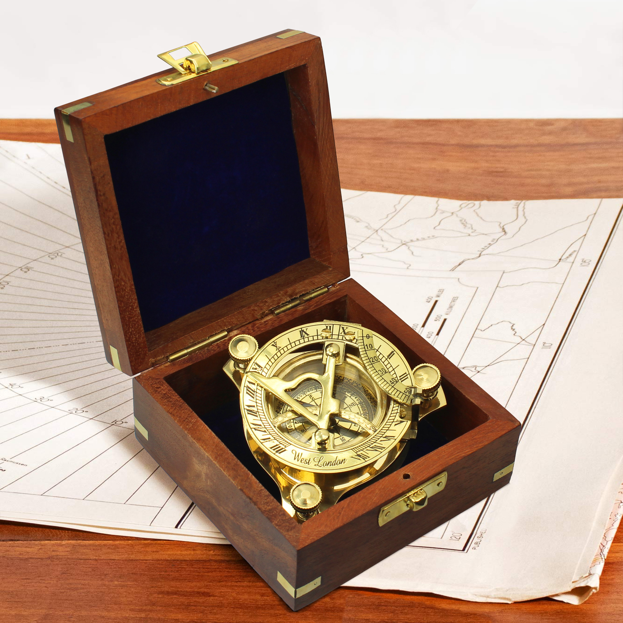 Eine besondere Geschenkidee in altehrwürdiger Goldoptik mit passender Geschenkbox in schlichtem Holzdesign. Übergebe die außergewöhnliche Taschensonnenuhr direkt in der stilvollen Box und überrasche abenteuerlustige Entdecker zu Geburtstagen, Weihnachten oder anderen Feierlichkeiten.