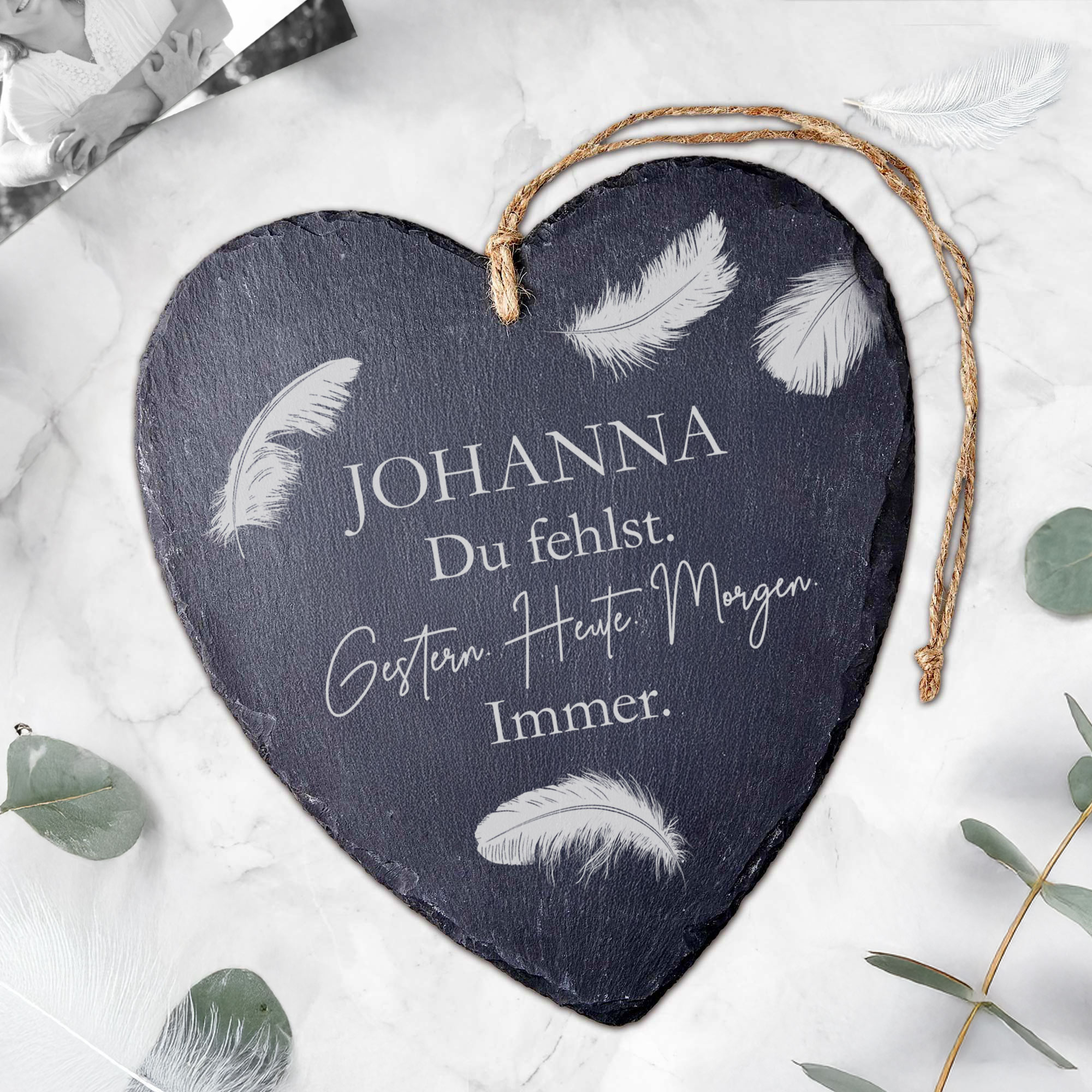Dieses liebevoll gestaltete Schieferherz mit der Gravur "Du fehlst. Gestern. Heute. Morgen. Immer." bietet einen stilvollen Weg, Ihre persönliche Erinnerung an einen geliebten Menschen auf besondere Weise festzuhalten. Der naturbelassene Schiefer verleiht der Gedenktafel eine authentische und zugleich zeitlose Ausstrahlung. Durch die individuelle Namensgravur wird das Trauerherz zu einem ganz persönlichen Andenken, das auf dem Grab, an einer Gedenkstätte oder im heimischen Garten einen würdevollen Platz findet.