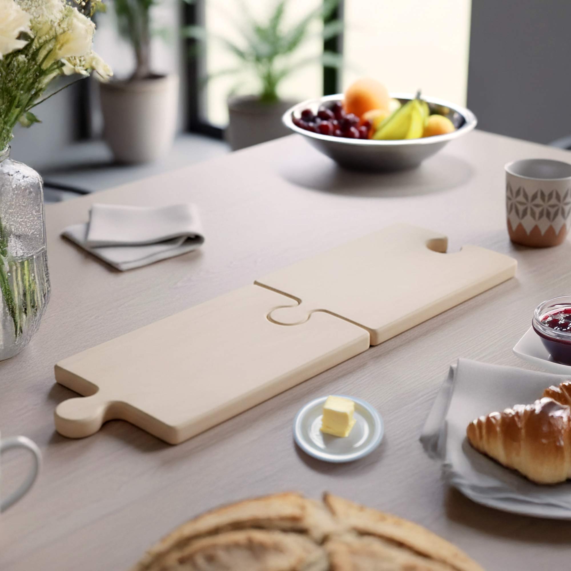 - Holzschneidebretter in Form eines Puzzleteils zum Portionieren und Servieren