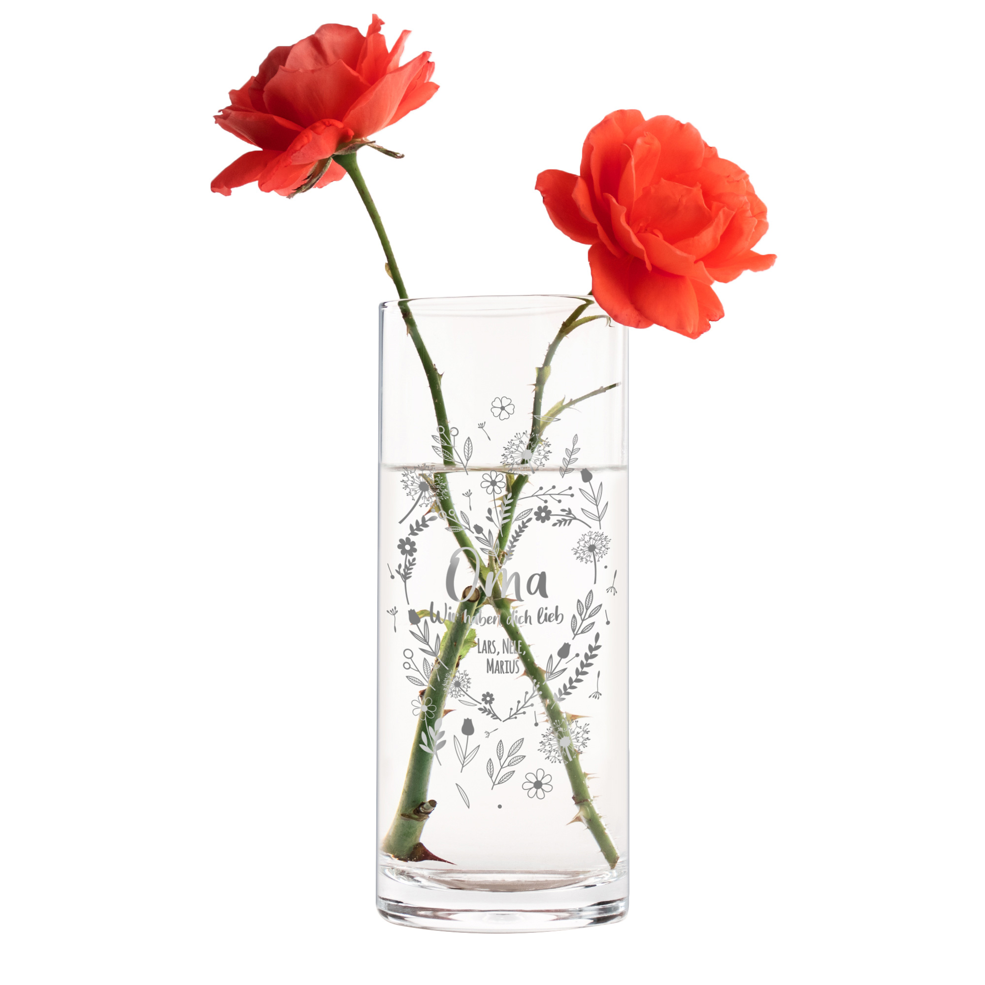Was schenkt man seiner Großmutter zu Weihnachten? Die Deko Vase mit individueller Gravur ist das perfekte Weihnachtsgeschenk für Deine Oma. Eine kleine Vase mit dem/n Name/n der/s Enkel/s und einem wundervollen Blumenherzmotiv besitzt garantiert niemand im ganzen Bekanntenkreis. Damit Dein Weihnachtsgeschenk perfekt wird, bestückst Du die praktische Glasvase mit einem Strauss der Lieblingsblumen Deiner Omi.