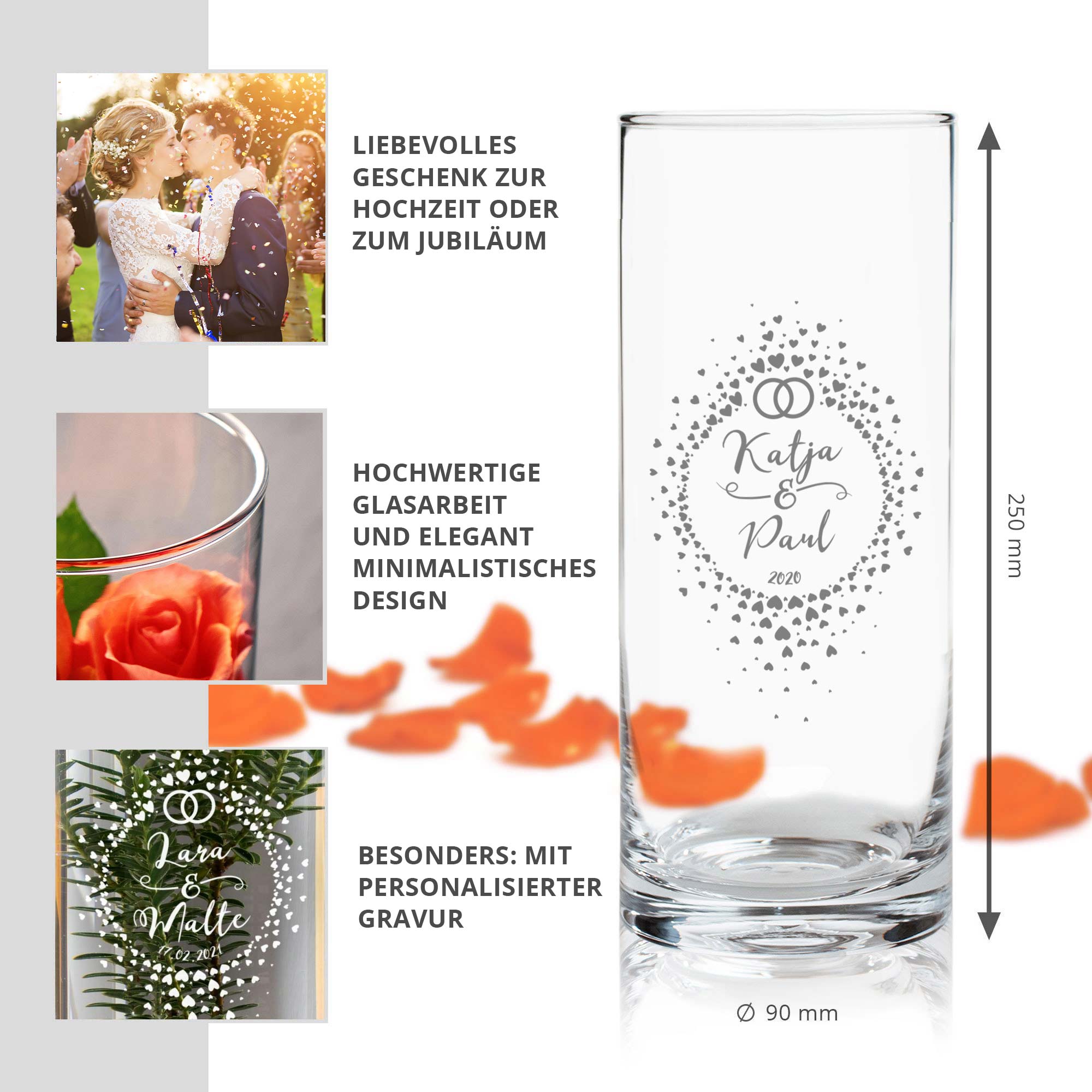 Romantische Hochzeitsgeschenke für das Brautpaar gibt es überall, doch die personalisierte Vase mit einem Herzchenkreis als Motiv ist dank hochwertiger Verarbeitung und sorgfältiger Gravur ein echtes Unikat! Die eingravierten Vornamen der Brautleute und die dazu passende Jahreszahl machen aus einer eleganten runden Vase eine besondere Dekoration mit persönlichem Touch und großem Erinnerungswert. Ob als Geschenk zur goldenen Hochzeit oder zu einem anderen Hochzeitsjubiläum, die runde Vase mit persönlicher Botschaft wird das Paar auf der Stelle verzaubern.