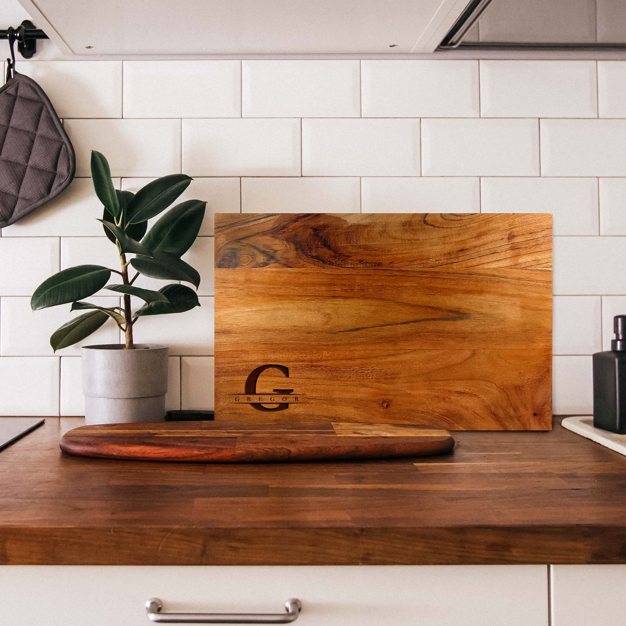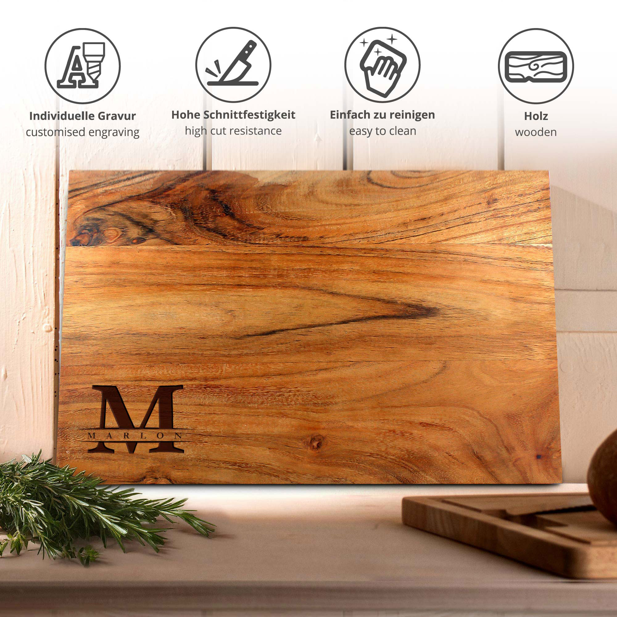 - Personalisiertes Schneidebrett mit eleganter Initial Gravur und Wunschname