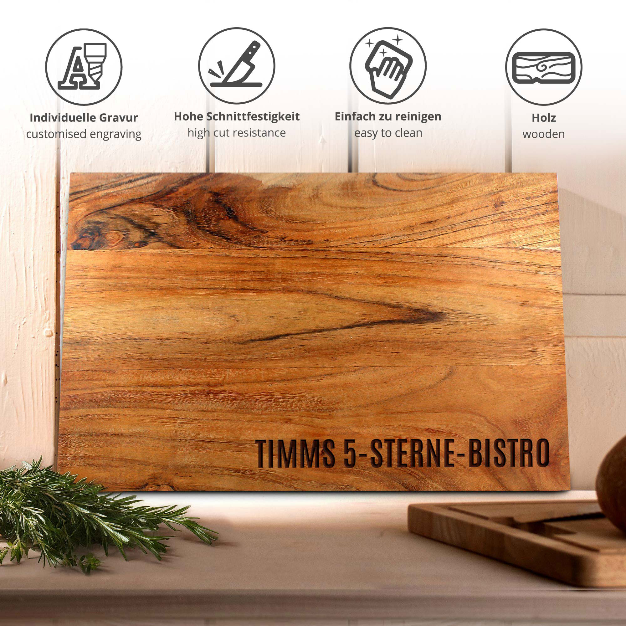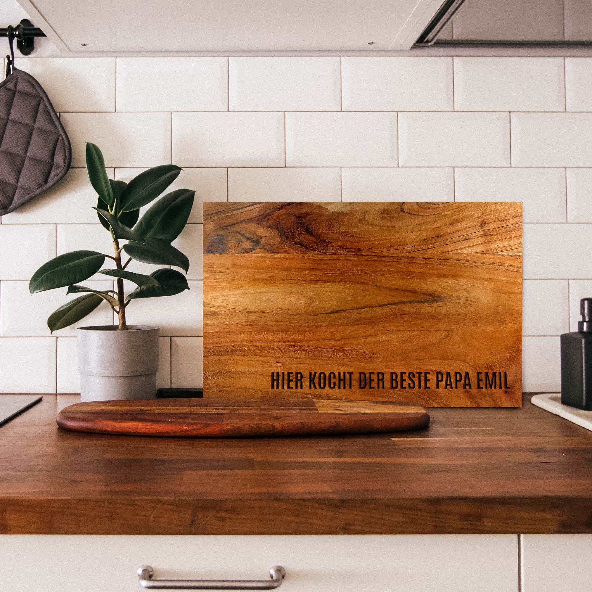 Dieses hochwertige Schneidebrett aus massivem Akazienholz wird mit Ihrem persönlichen Wunschtext zu einem einzigartigen Unikat. Ob Name, Datum, liebe Botschaft oder individuelles Zitat – die präzise eingearbeitete Gravur verleiht dem Holzbrett eine ganz persönliche Note und macht es zu einem besonderen Blickfang in jeder Küche. Durch die edle Maserung des Akazienholzes entsteht ein harmonisches Gesamtbild, das Funktionalität und Individualität stilvoll vereint.