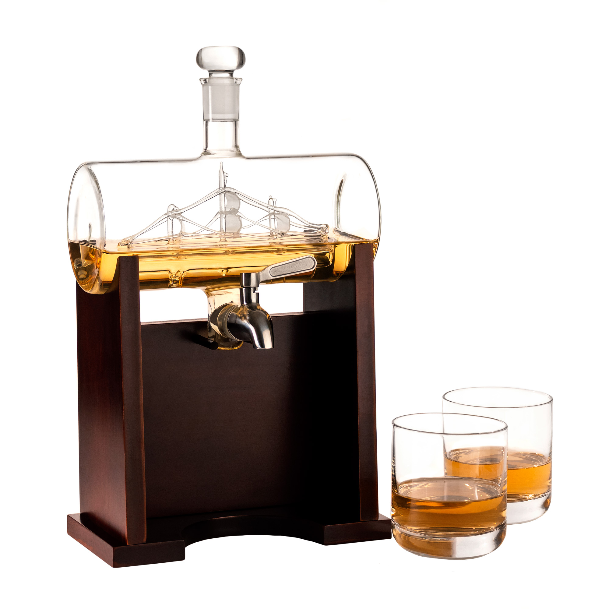 - Barrel Dekanter aus Klarglas mit dekorativem Segelschiff im Inneren