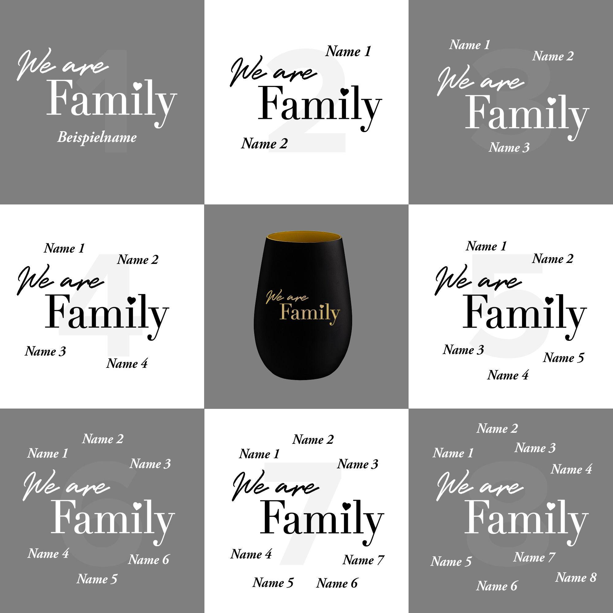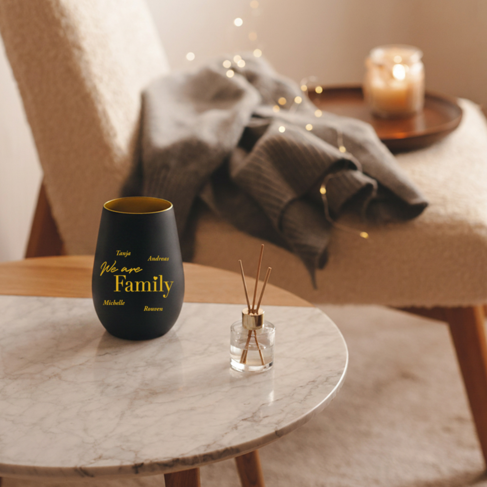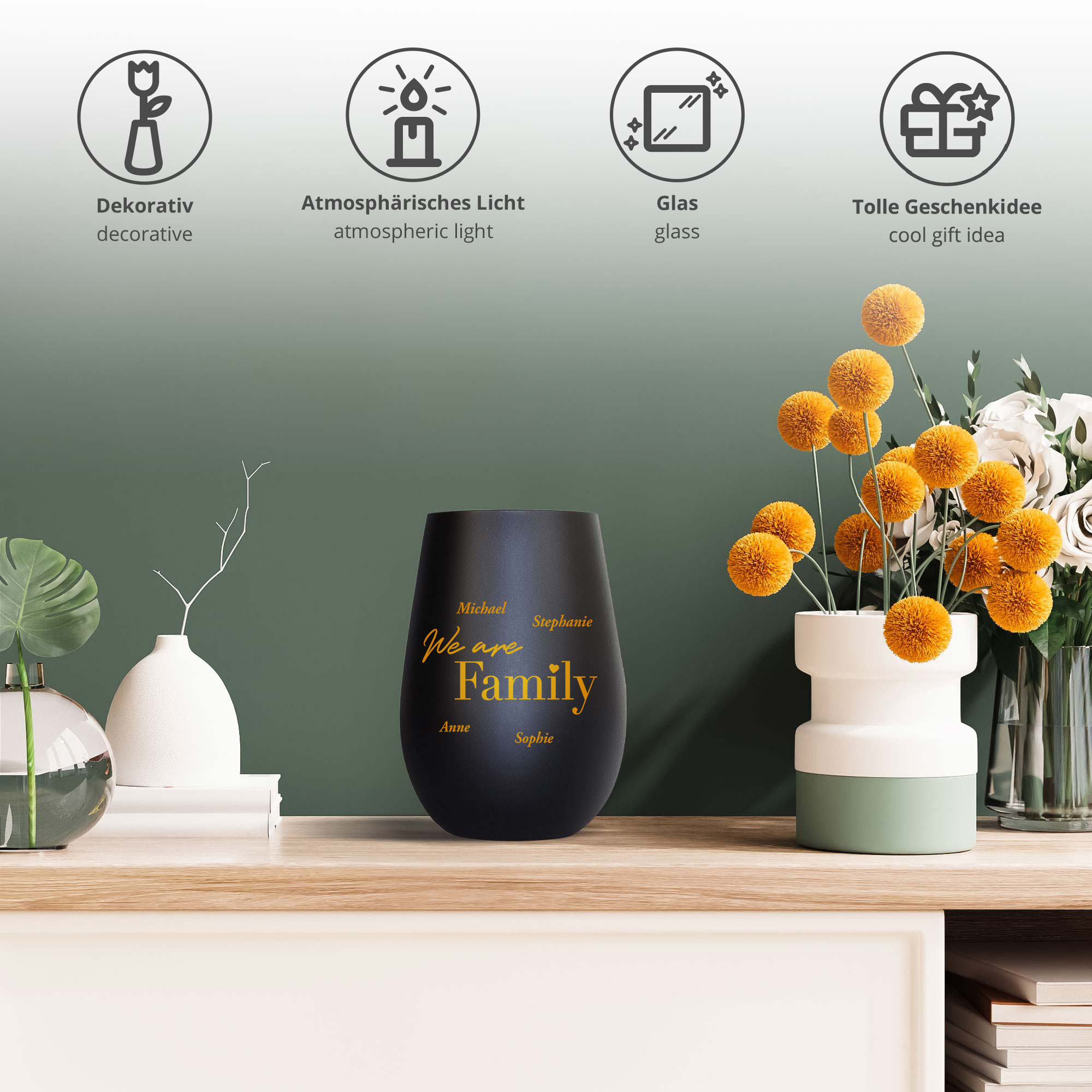 Dieses stilvolle Windlicht aus schwarzem Glas mit edler goldener Gravur ist eine besondere Hommage an die Familie. Das Motiv "We are Family" wird durch die individuellen Namen der Familienmitglieder ergänzt und macht jedes Windlicht zu einem einzigartigen Unikat. Die hochwertige Gravur sorgt für einen eleganten Kontrast zur dunklen Glasoberfläche und verleiht dem Design eine moderne und zugleich warme Ausstrahlung.