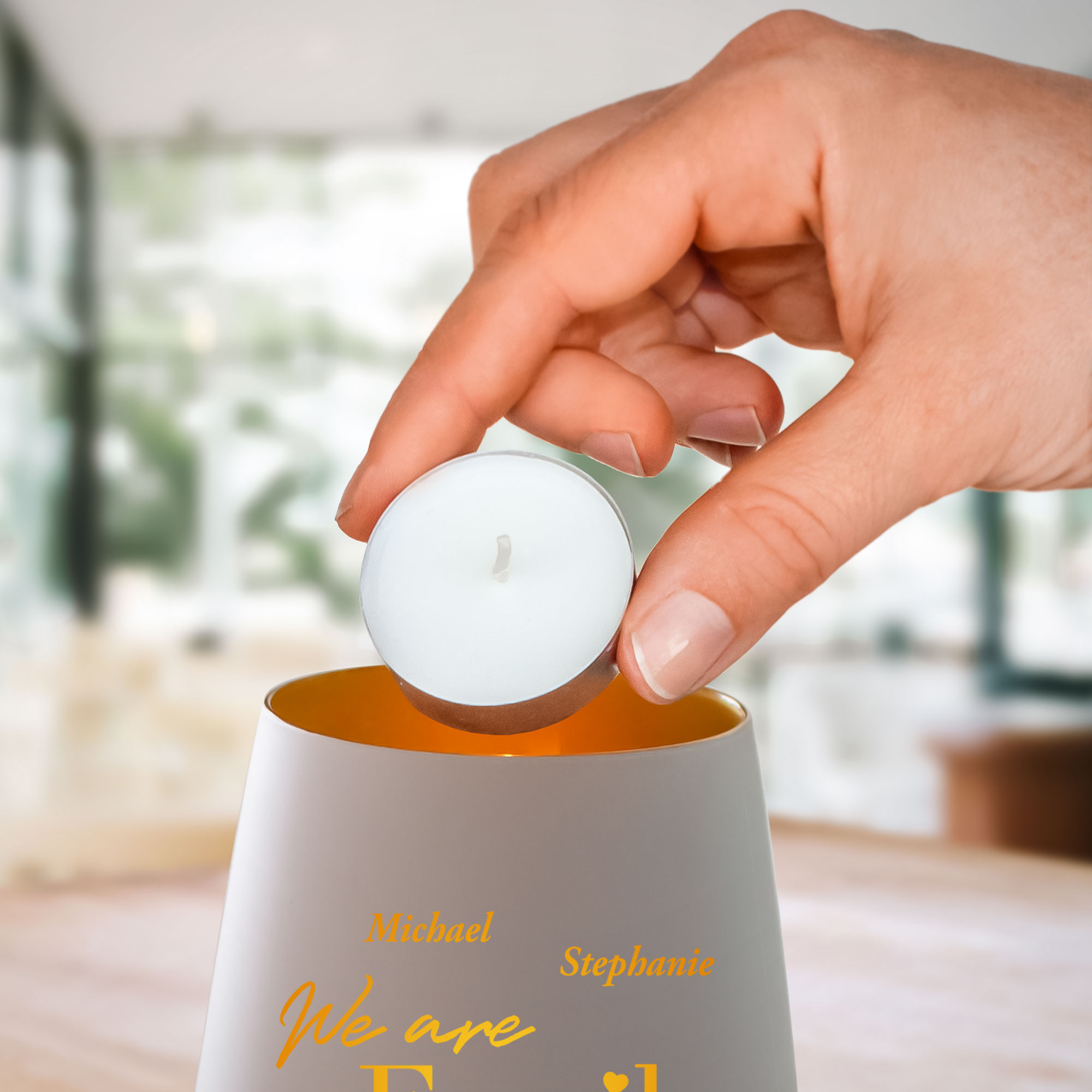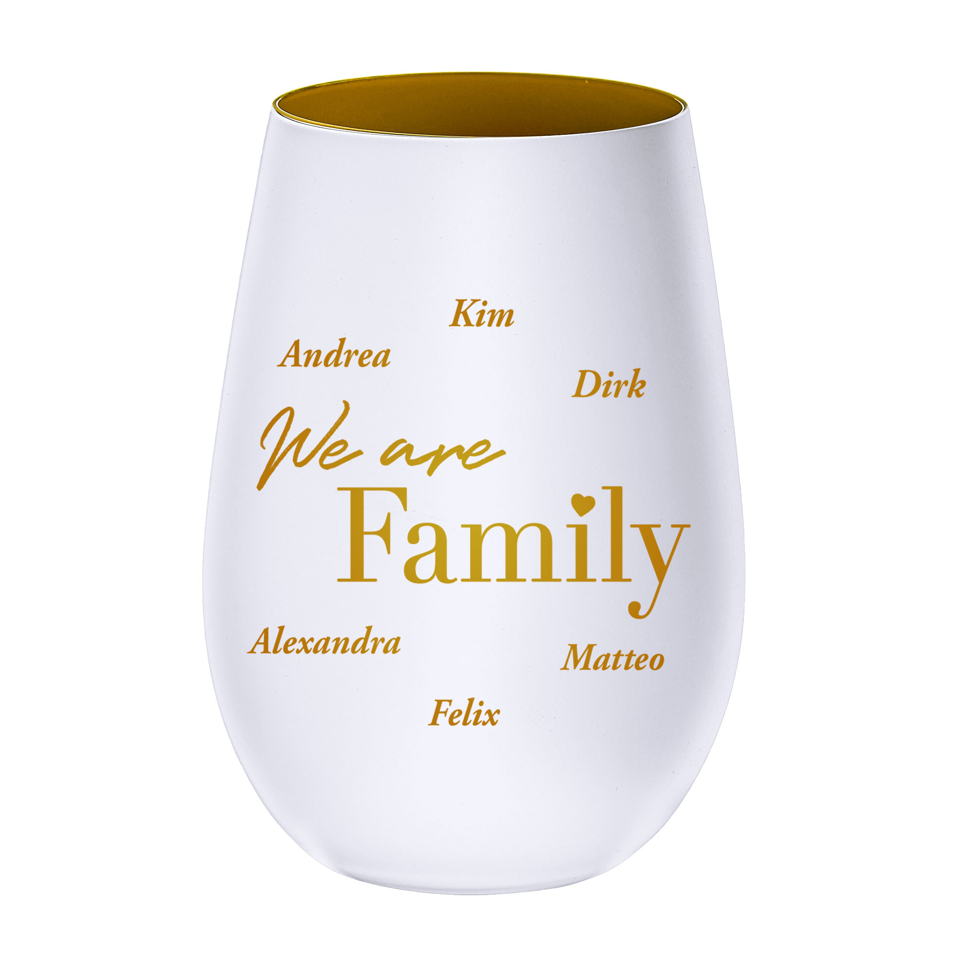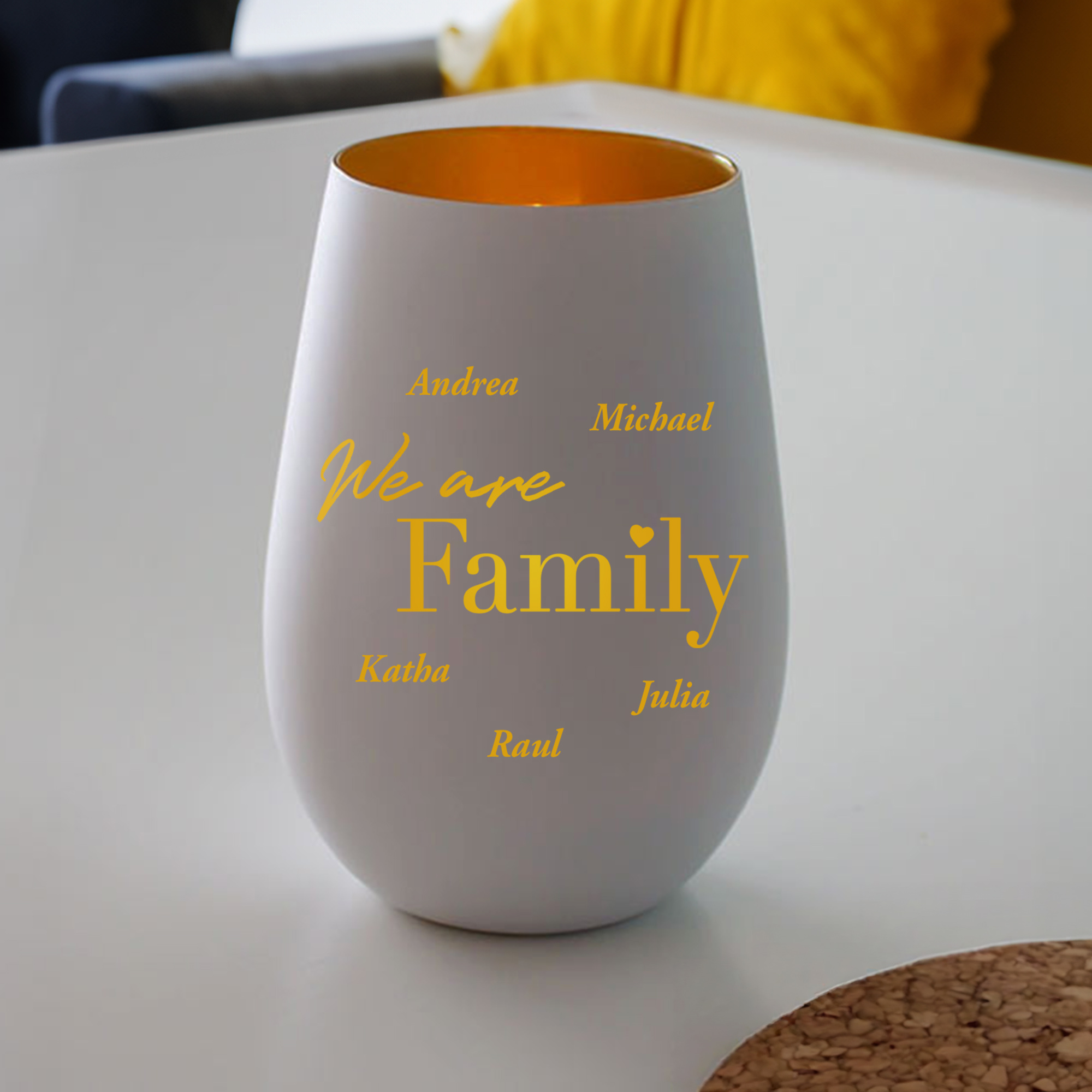 Dieses elegante Windlicht aus weißem Glas mit goldener Gravur vereint modernes Design mit persönlicher Bedeutung. Das Motiv We are Family wird individuell mit den Namen Ihrer Familie ergänzt und macht den Kerzenhalter zu einem ganz besonderen Erinnerungsstück. Die helle Glasfarbe in Kombination mit der goldenen Gravur sorgt für eine zeitlose und harmonische Optik.