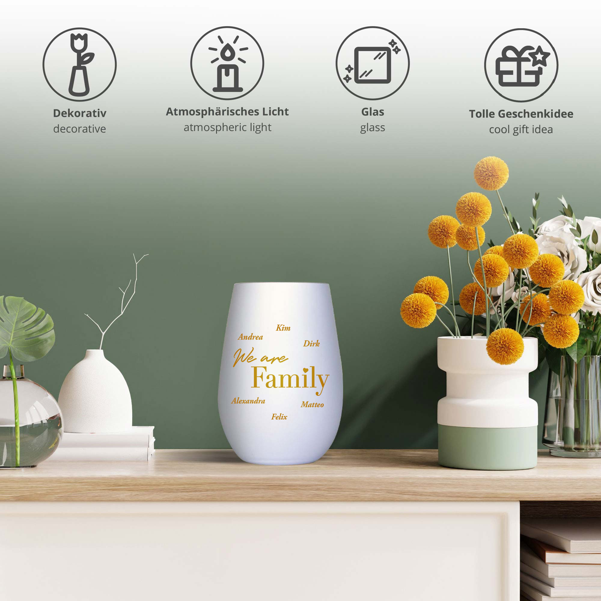 Als dekorativer Teelichthalter bringt das Windlicht eine warme und einladende Atmosphäre in jeden Raum. Ob im Wohnzimmer, auf dem Esstisch oder als Geschenk – dieses personalisierte Windlicht ist eine stilvolle Möglichkeit, die Verbundenheit innerhalb der Familie sichtbar zu machen.