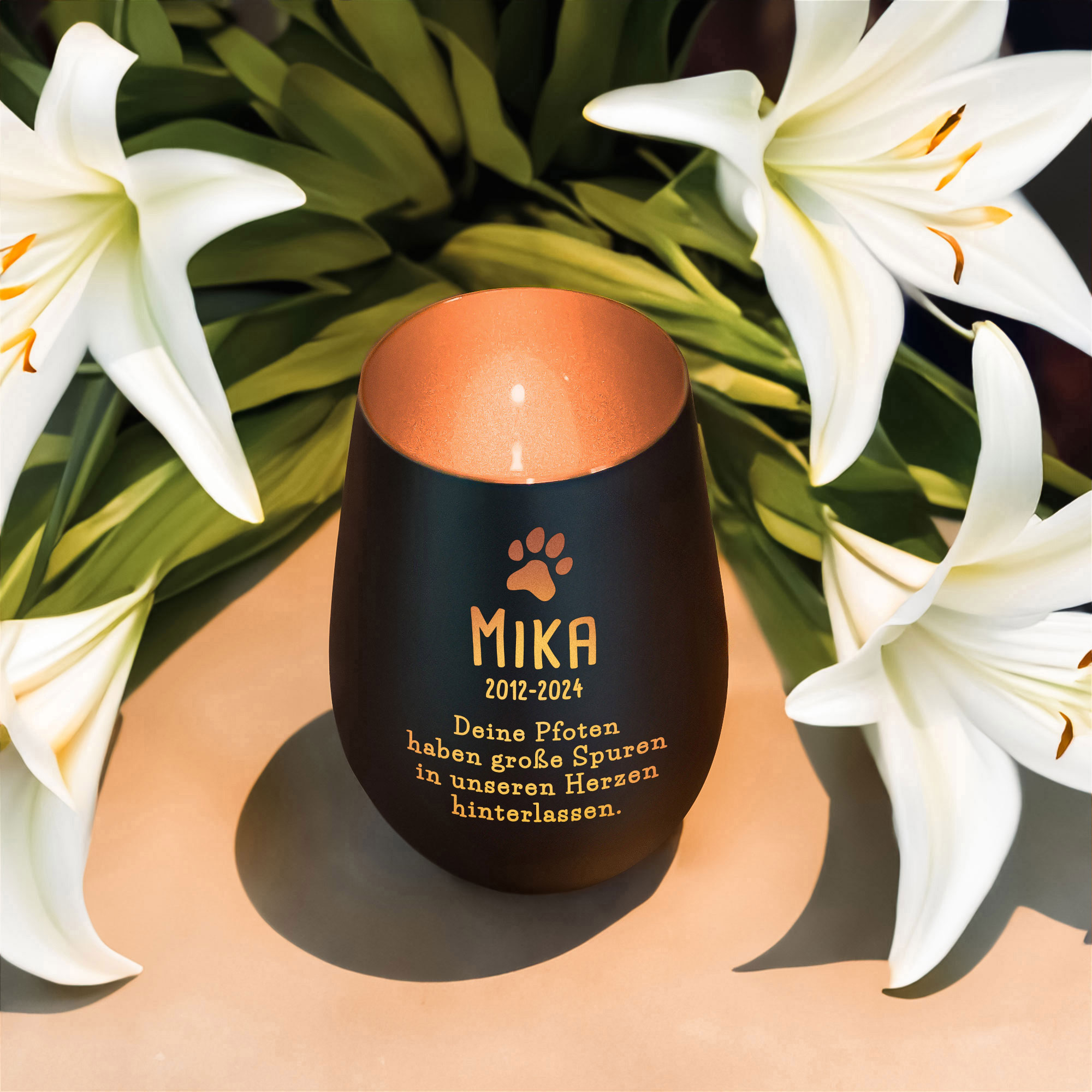Dieses schwarze Trauerlicht Windlicht mit bronzefarbener Gravur ist ein einfühlsames Gedenklicht für einen treuen Begleiter auf vier Pfoten. Die Vorderseite des hochwertigen Kerzenhalters aus Glas zeigt eine zarte Pfote, ergänzt durch die individuelle Gravur des Namens und der Lebensdaten Deines Hundes. Der Trauerspruch “Deine Pfoten haben große Spuren in unseren Herzen hinterlassen“ verleiht dem Erinnerungslicht emotionale Tiefe.