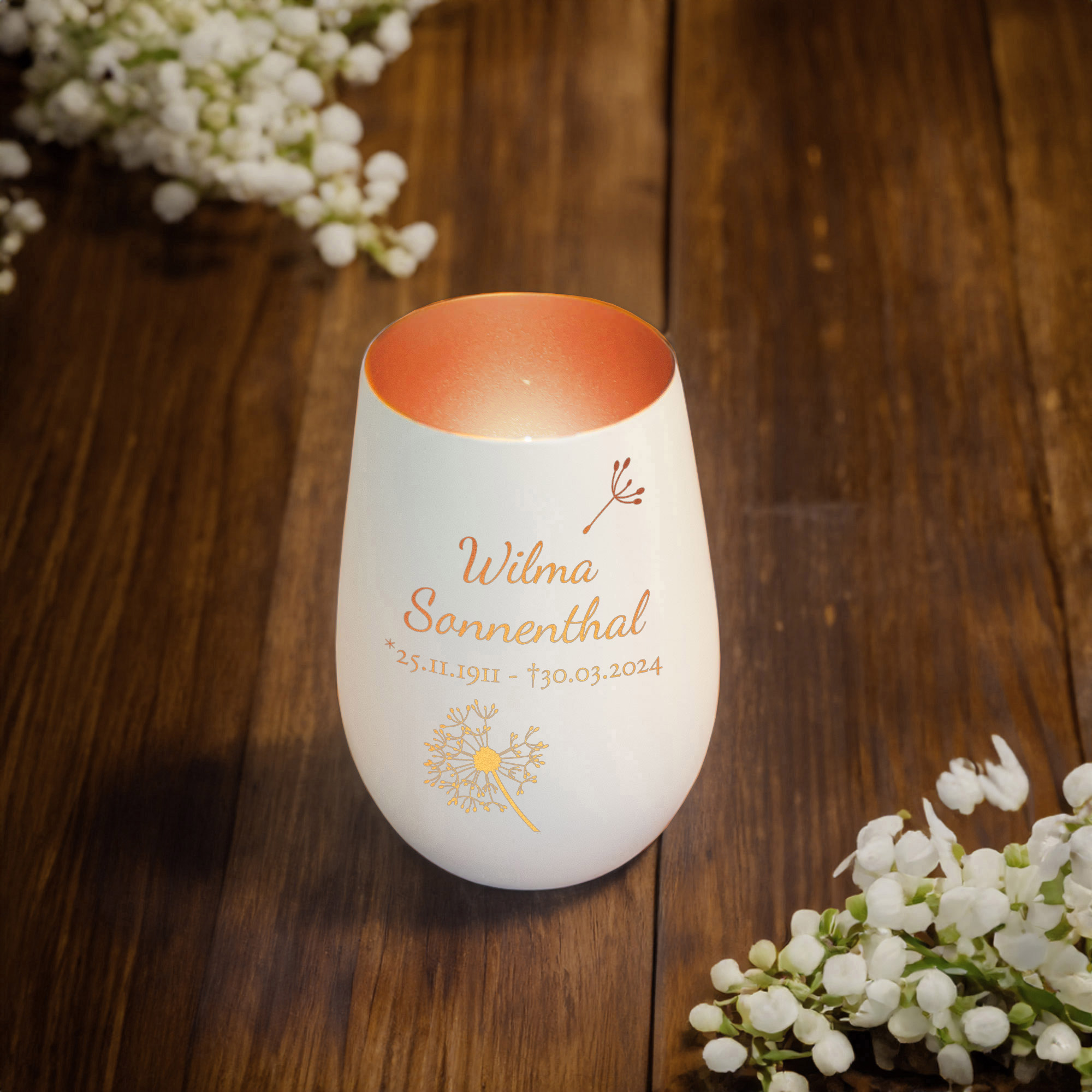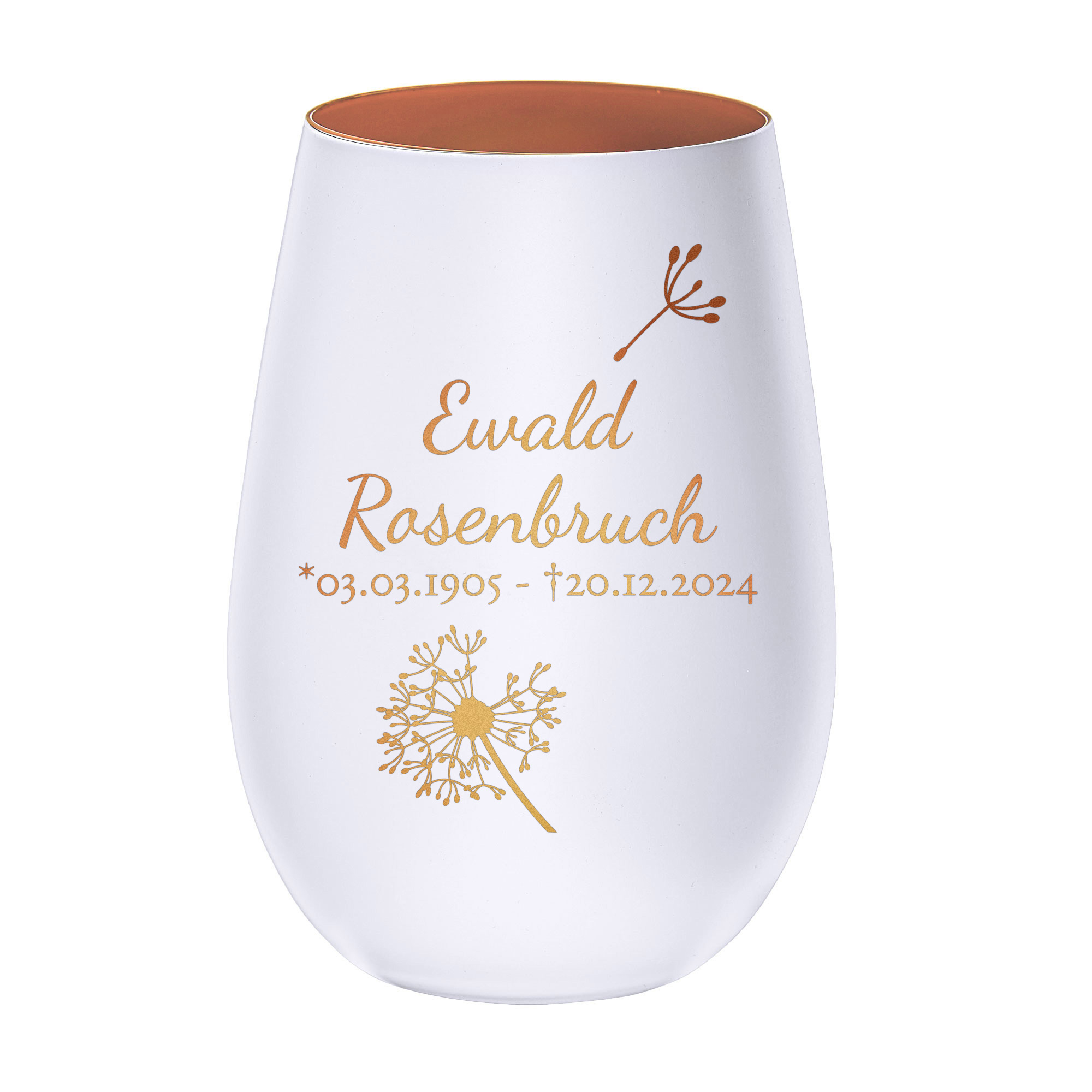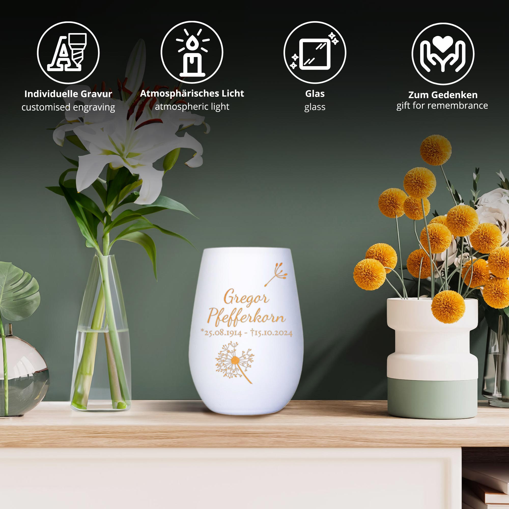 Das weiße Trauerlicht Windlicht mit bronzefarbener Gravur kann zum besonderen Trostspender in Zeiten des Abschieds werden. Der Kerzenlichthalter ist aus edlem Glas gefertigt und mit einer bronzefarbenen Gravur versehen: Neben Namen und Lebensdaten des geliebten Menschen ziert eine feine Pusteblume das Motiv – ein Symbol für die Vergänglichkeit des Menschen und zeitgleich das Weiterleben in unseren Gedanken.